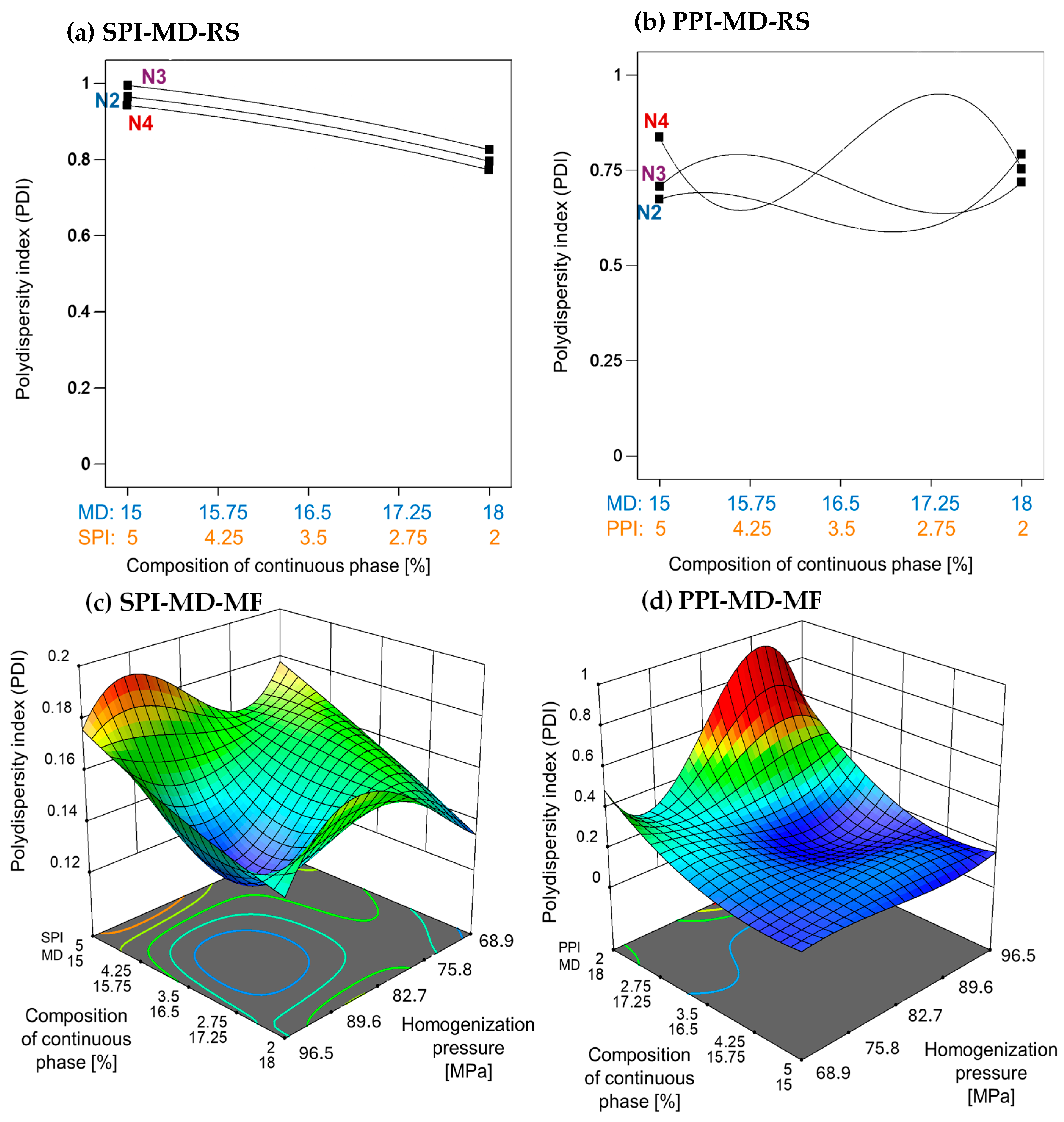 | PPI-MD-RS | ζ potential | N2: −1.12A + −10.63B + 0.52AB N3: −3.25A − 71.89B + 4.83AB N4: −0.91A − 2.31B − 0.13AB | 0.89 |