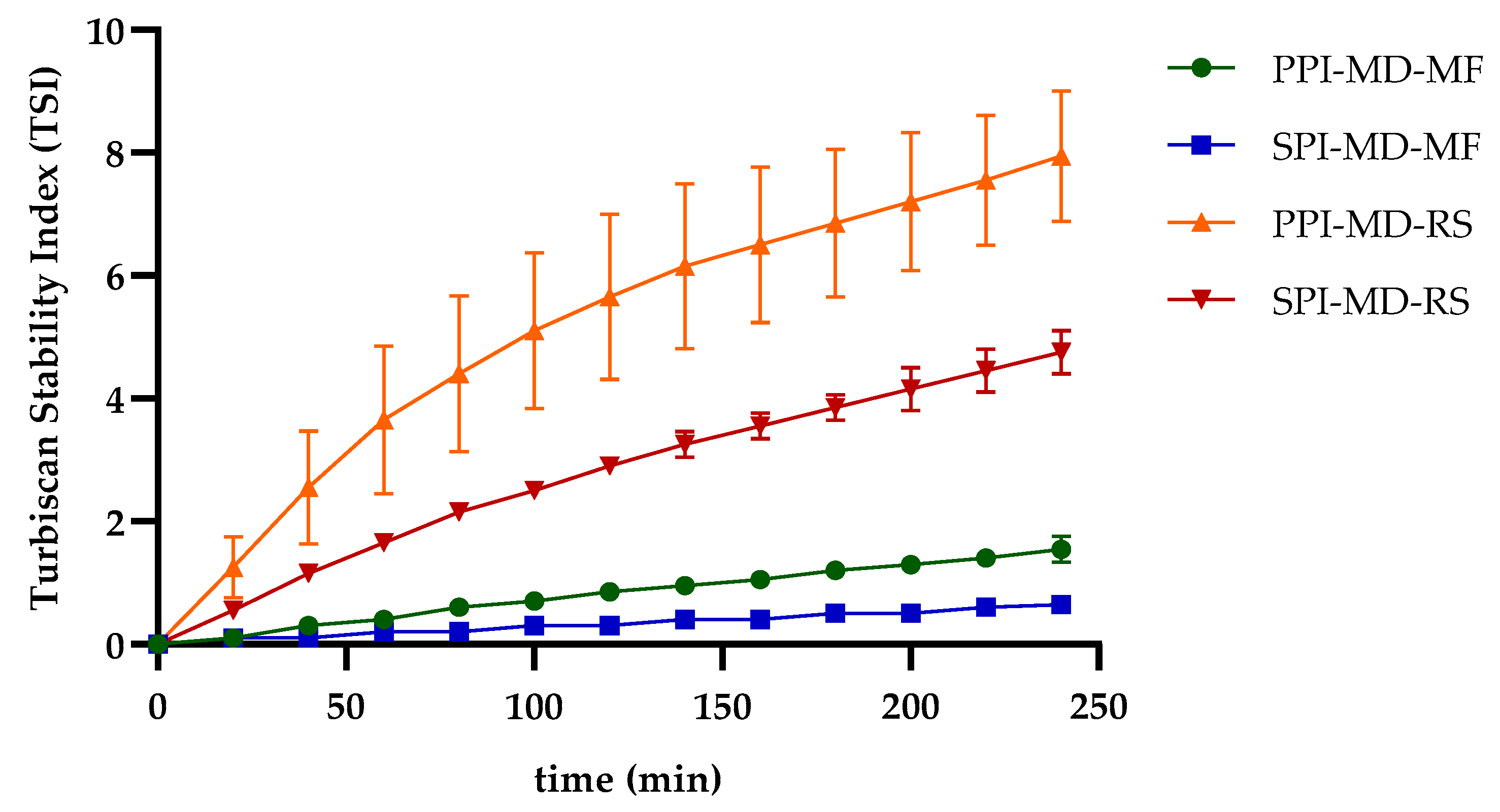 3.6. Turbiscan Stability Index Modeling of Emulsion Stability Kinetics