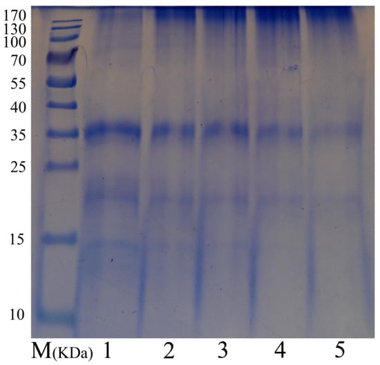 Electrophoresis analysis was conducted on native RDP, cross-linked RDP, and a protein molecular weight marker (10–170 kDa) to characterize protein band molecular weights and size profiles, as shown in Figure 1. Native RDP (lane 1) displayed three major subunits with molecular weights (Mw) near 35, 20, and 15 kDa, consistent with prior findings by Zhao et al. [7]. These bands are tentatively assigned as putative glutelins and albumins based on their approximate molecular weights. In samples modified by TG (lanes 2–5), a progressive decrease in the intensity of these three subunits was observed as the concentration of TG increased. Meanwhile, new peptide bands with high molecular weights (≥170 kDa) emerged at the upper part of the gel. The intensity of the high-molecular-weight bands observed in the study is directly proportional to the TG dosage, which indicates that TG induces the cross-linking of RDP subunits to form polymeric structures.