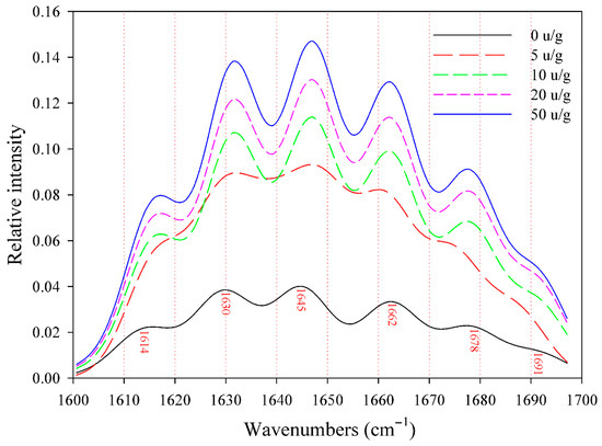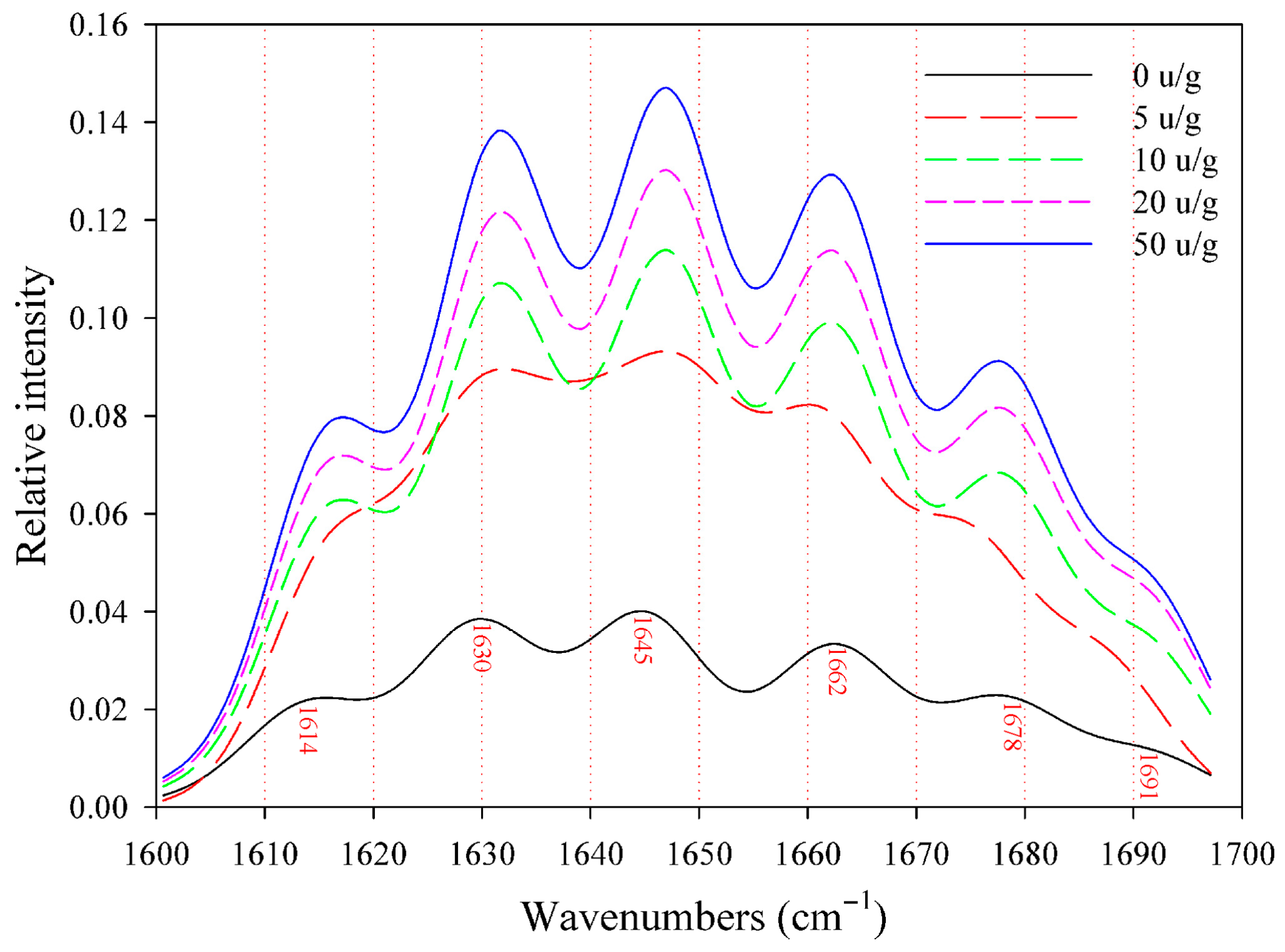 FTIR spectra (400–4000 cm−1) of native and TG-treated RDP at different enzyme concentrations (5–50 U/g). Progressive changes in amide I and II bands indicate alterations in secondary structure.