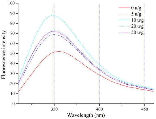 As shown in Figure 4B, surface hydrophobicity values of cross-linked RDP decreased with increasing cross-linking extent from 0 to 10 U/g and then increased. This result aligns with the pattern observed in intrinsic emission fluorescence spectra. It is hypothesized that TG-induced cross-linking leads to protein aggregation via hydrophobic and electrostatic forces, thereby preventing hydrophilic groups from ANS binding. Notably, TG-induced cross-linking of soybean protein resulted in higher surface hydrophobicity [30,48], whereas acacia gum conjugation of soybean protein or glucose conjugation of β-lactoglobulin caused lower surface hydrophobicity. Furthermore, the oligomerization process of milk proteins has been demonstrated to reveal protein structures, bringing to light hydrophobic amino acid residues that are hidden within the tertiary configuration of native protein molecules [49]. This phenomenon plays a role in enhancing the surface hydrophobicity of cross-linked proteins.