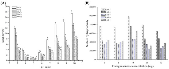 (A) Effect of pH (3–10) on the solubility (%) of native and TG-treated RDP (1% w/v, 25 °C). (B) Surface hydrophobicity (H0) determined using ANS probe across pH 3–11. Error bars represent standard deviations (n = 3). Different letters indicate statistically significant differences among sample means (p < 0.05, Tukey’s HSD test). Samples sharing the same letter at a given point are not significantly different.