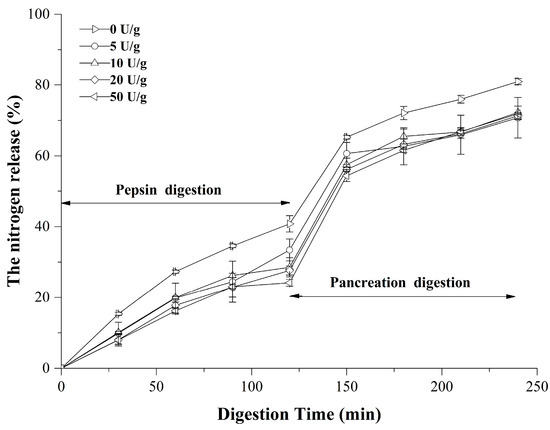 Digestibility serves as a key indicator of protein bioavailability [55]. The assessment of the in vitro digestibility for both native and cross-linked RDP was conducted, with the findings illustrated in Figure 6. All protein samples exhibited comparable digestion trends: the amount of TCA-soluble nitrogen dropped with the degree of cross-linking. During the initial 120 min of pepsin digestion, followed by a further 120 min of trypsin digestion, TCA-soluble nitrogen increased rapidly and then slowed down. Notably, cross-linked RDP exhibited significantly lower TCA-soluble nitrogen than native RDP throughout the in vitro digestion process. The digestion pattern of RDP was analogous to that found by Jiang and Zhao [25], who demonstrated that TGase-induced cross-linking of soy protein decreased pepsin + trypsin digestibility compared to its native counterpart.