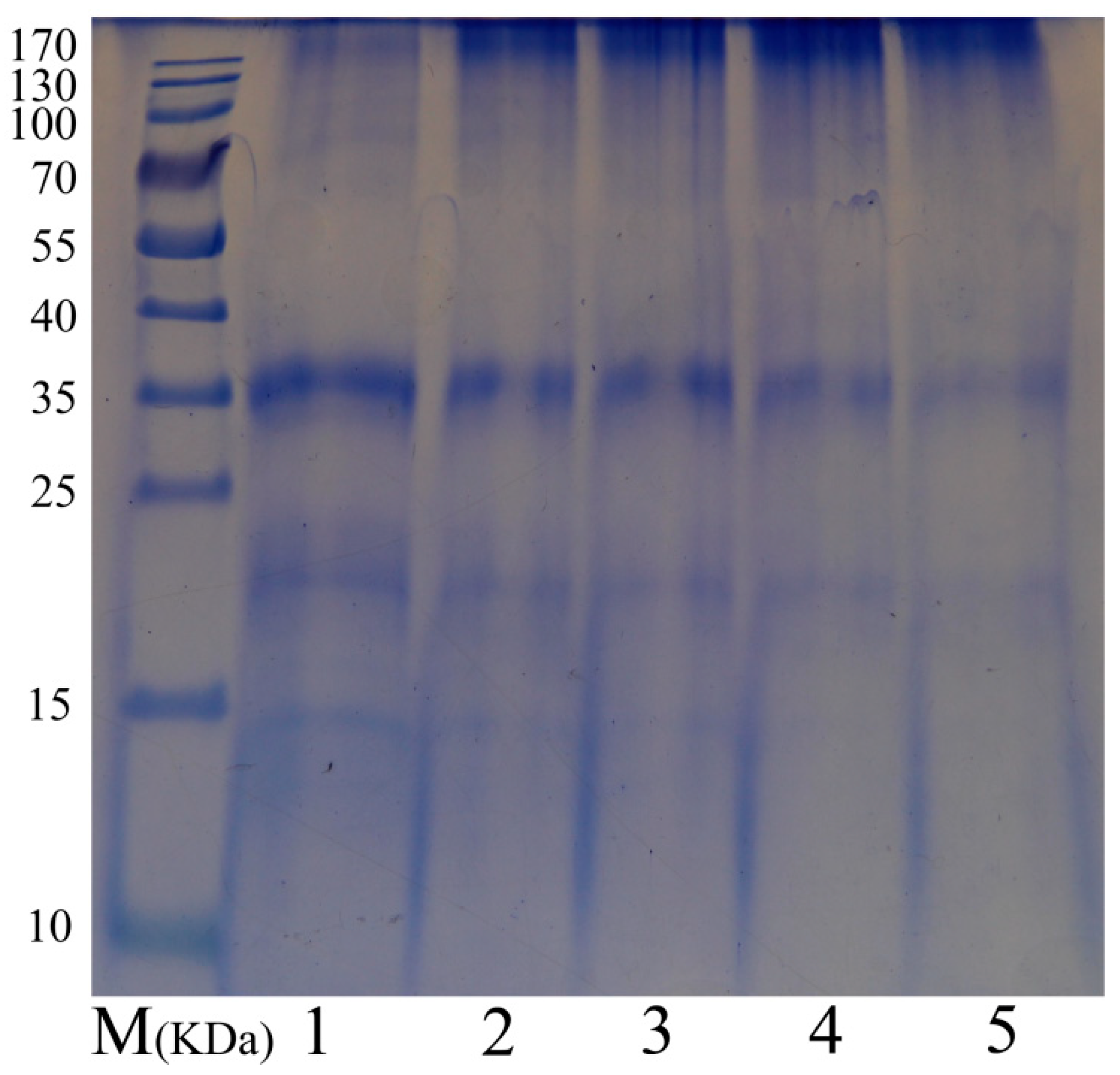 SDS-PAGE profile of native and TG-treated RDP with different enzyme concentrations. Lane M: Molecular weight marker; Lane 1: Native RDP (0 U/g); Lanes 2–5: TG-treated RDP at 5, 10, 20, and 50 U/g protein, respectively.