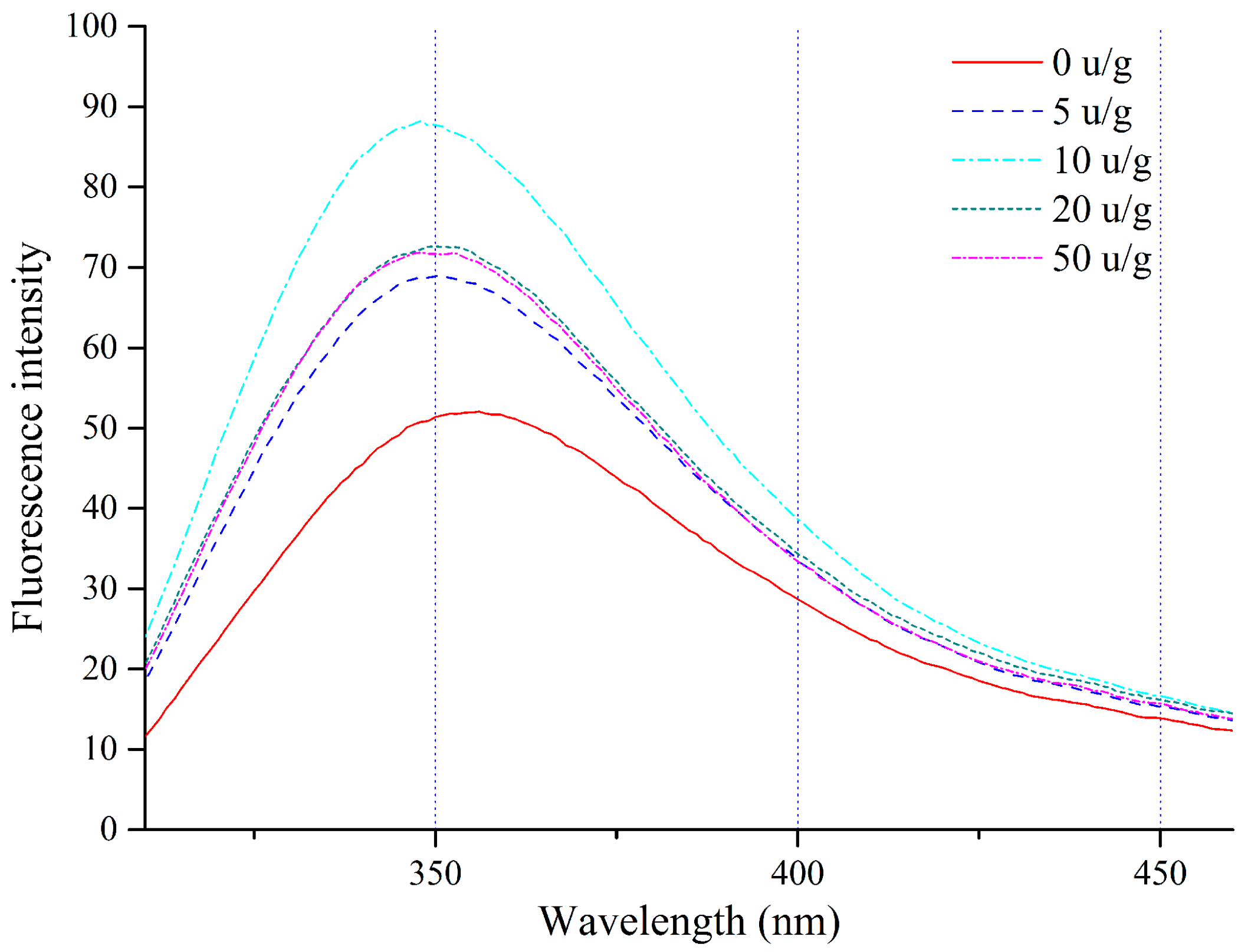 Fluorescence spectra of the samples’ intrinsic emission were obtained utilizing a Hitachi F-4500 fluorophotometer (Hitachi Co., Kyoto, Japan). The samples were excited at a wavelength of 280 nm. The emission spectrum was recorded over a range of wavelengths from 290 to 420 nm, with a consistent gap width of 5 nm maintained throughout the measurement process.