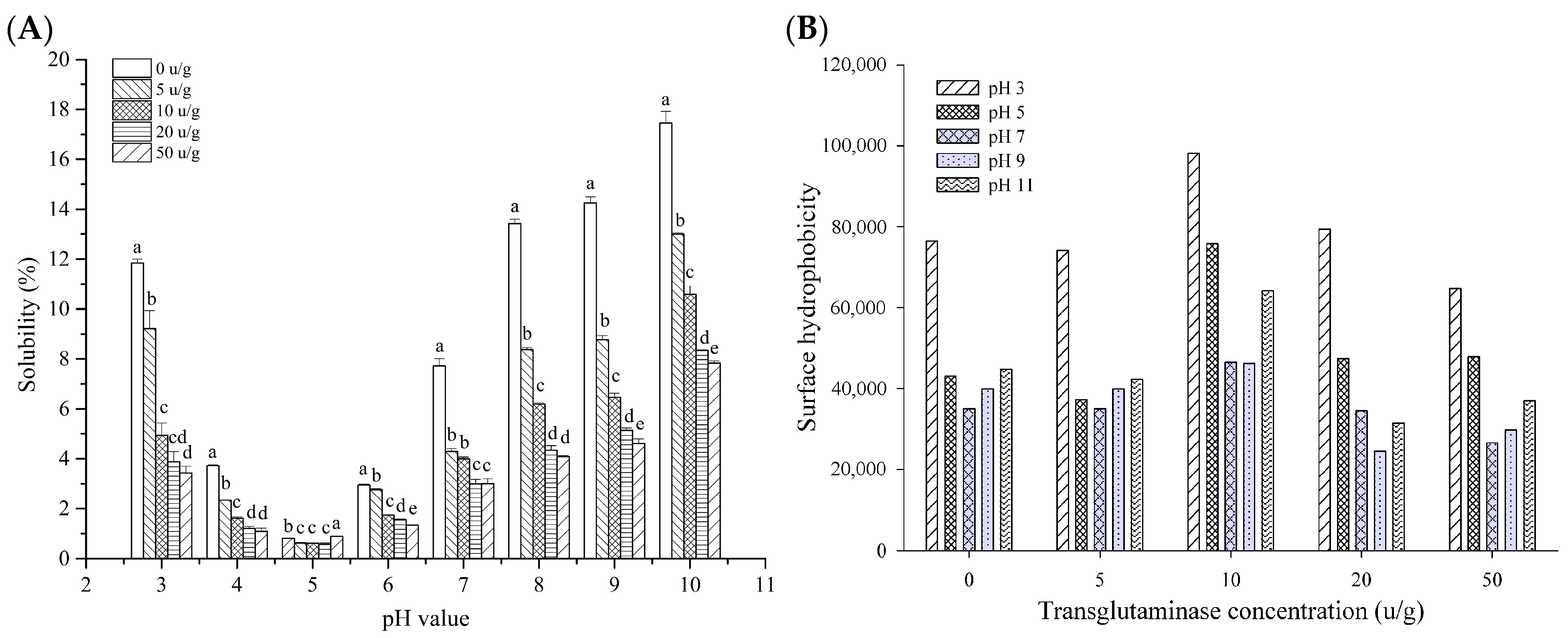 Significantly, the solubility of cross-linked RDP exhibited a decrease that depended on the dosage as the concentration of TG increased, especially under highly acidic (pH 3) and alkaline (pH > 7) environments. This is due to TG-induced cross-linking of proteins, which facilitates the development of elongated polypeptide chains and high-molecular-mass aggregates. These structural changes limit protein hydration and dispersibility, a mechanism previously observed in vicilin-rich kidney bean proteins [41] and TG-treated peanut proteins.