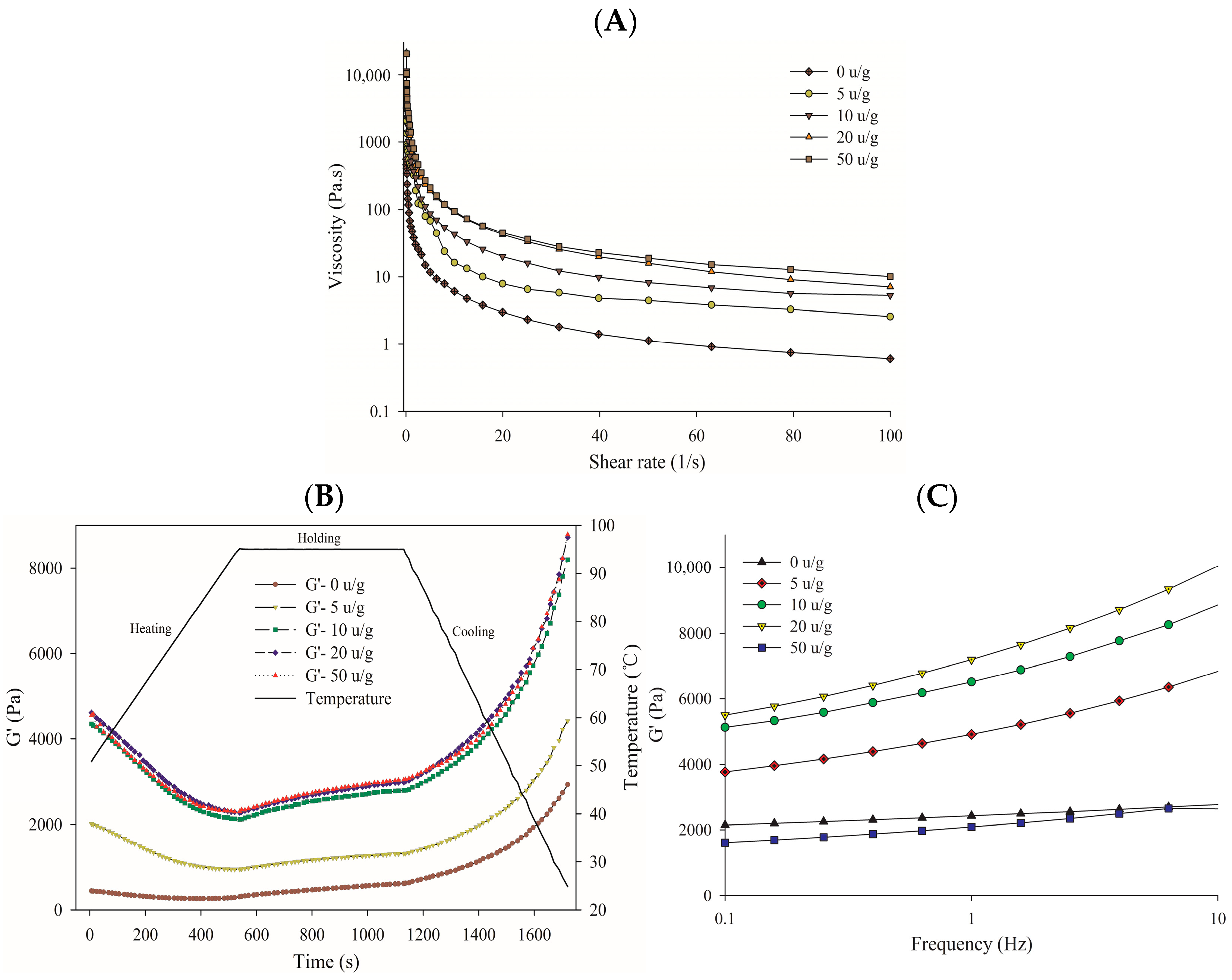 The flow characteristics of the dispersions (16% w/v) made with RDP and cross-linked RDP are illustrated in Figure 5A. Each of the dispersions demonstrated thixotropic properties (shear thinning), and a notable rise in apparent viscosity was noted for the TG-catalyzed cross-linked RDP. This result is consistent with previous findings on cross-linked casein micelles [50], soybean protein [25], and casein [39] treated with TG. The rheological properties of a protein suspension are influenced by factors such as molecular size, shape, interactions with ionic solvents, conformation, hydrodynamic volume, and flexibility in the hydrated state [51]. In this study, the development of protein polymers characterized by greater molecular weights and larger molecular volumes primarily contributed to the rise in apparent viscosity.