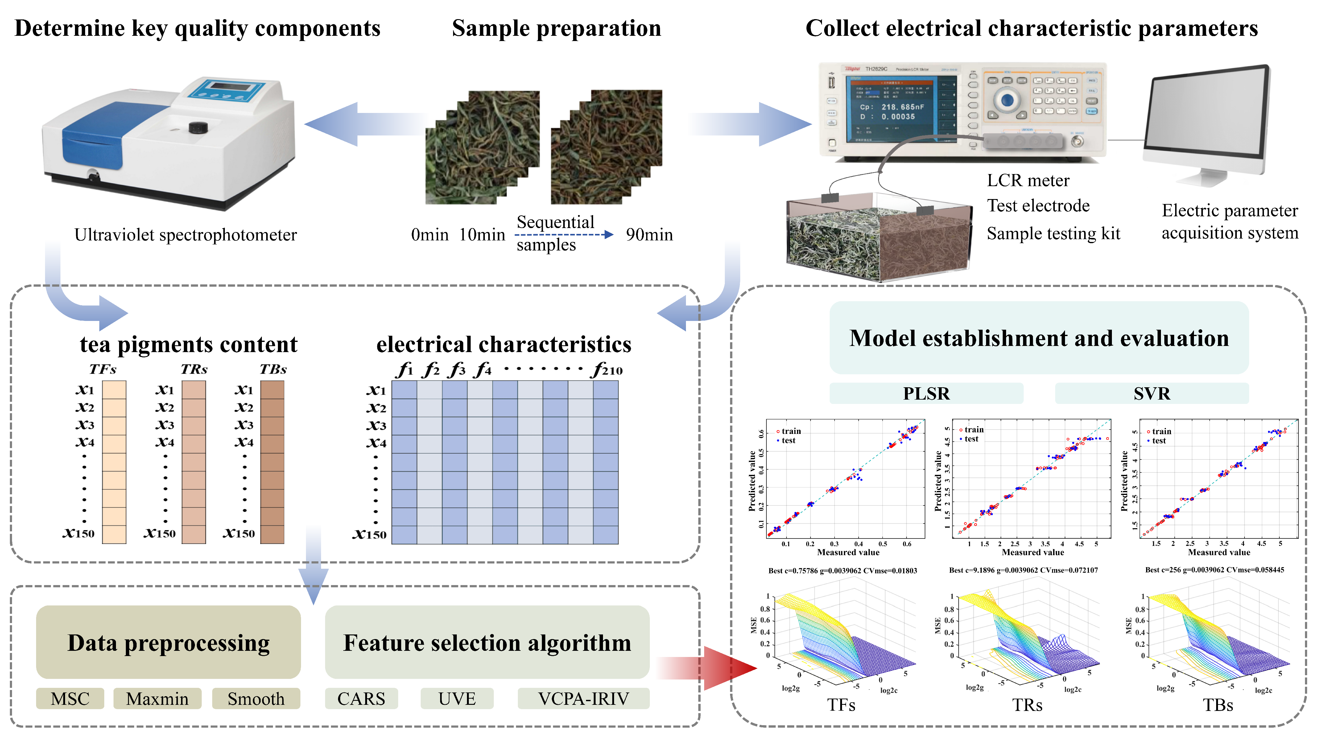 In summary, this study targets tea pigments during black tea rolling and innovatively applies electrical characteristic-detection technology to collect seven electrical parameters from sequential rolling samples at thirty different test frequencies. Artificial intelligence algorithms were used to select feature frequencies and electrical parameters correlated with tea pigment content. Based on these features, both linear (PLSR) and nonlinear (SVR) quantitative prediction models were developed and compared to achieve rapid, non-destructive sensing of tea pigments during rolling. The specific steps of the study are as follows: (1) Preparation of sequential black tea rolling samples. (2) Collection of sample electrical characteristic parameter information. (3) Accurate determination of tea pigment content. (4) Data preprocessing and screening characteristic variables. (5) The prediction model of tea pigment based on electrical characteristic detection technology was established and compared. The overall research approach and technical route are illustrated in Figure 1.