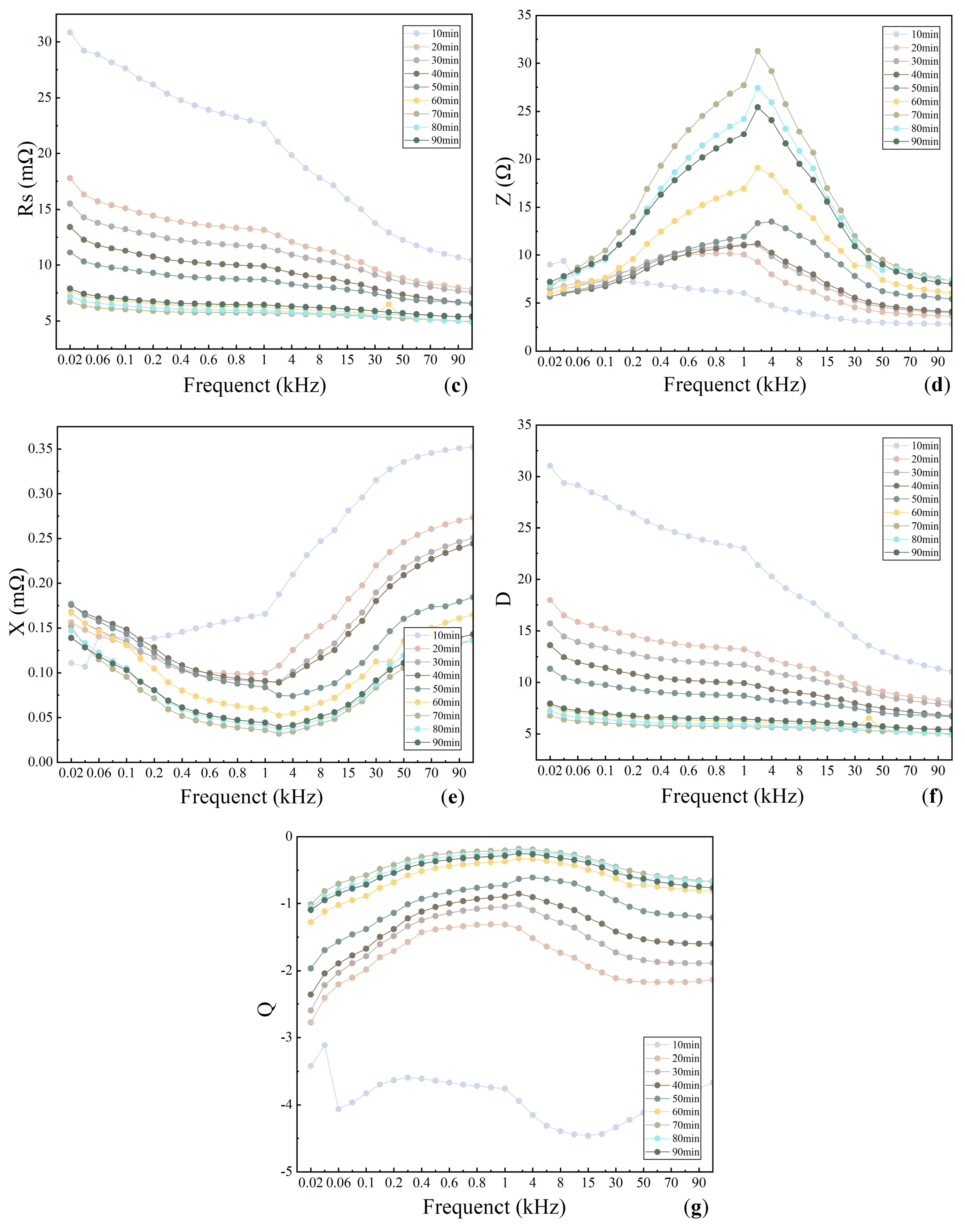Figure 2a–g illustrate the variation trends in the electrical parameters by testing frequency at different rolling times. As shown in Figure 2a,b, Ls and Cs exhibited opposite trends: Ls increased with frequency, while Cs decreased, with both showing the most pronounced variations in the low-frequency range. Additionally, both Ls and Cs displayed an overall increasing trend as rolling time progressed. According to Figure 2c,f, although the absolute values of Rs and D differed, their variation patterns were generally consistent, both decreasing gradually with increasing frequency. As rolling time extended, Rs and D values showed a decreasing trend, with more evident changes in the low-frequency region. From Figure 2d,e,g, Q and Z initially increased and then decreased with frequency, whereas X exhibited an opposite trend, decreasing first and then increasing. With prolonged rolling time, Q and Z increased, while X decreased. Variations in Q and Z were more substantial at low-to-medium frequencies, while changes in X were more significant at higher frequencies. However, a notable inflection point in the trends of these electrical parameters occurred after 70 min of rolling. This phenomenon is likely associated with biochemical and physical changes resulting from tea cellular disruption under continuous mechanical stress. Prolonged rolling may alter polyphenol oxidase activity, reduce catechin and flavonoid content, and cause severe cellular damage leading to excessive tea juice exudation, all of which can collectively influence the electrical characteristics of the leaves [4]. In summary, testing frequency had a more pronounced effect on the electrical parameters of black tea during rolling than rolling time itself.