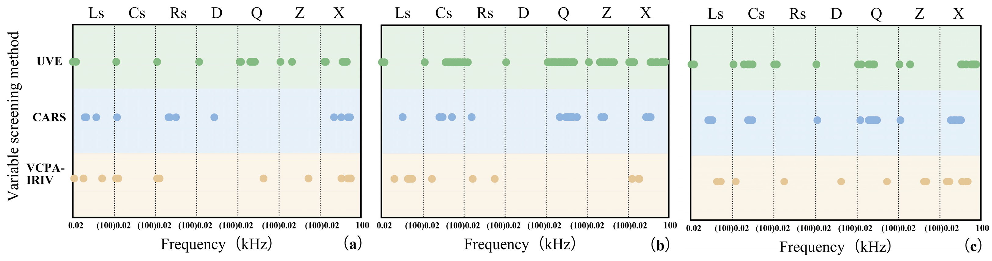 Figure 4. The characteristic electrical characteristic parameter variables selected by UVE (marked with green ⚪), CARS (marked with blue ⚪) and VCPA-IRIV (marked with yellow ⚪) were used to analyze (a) TFs, (b) TRs and (c) TBs.