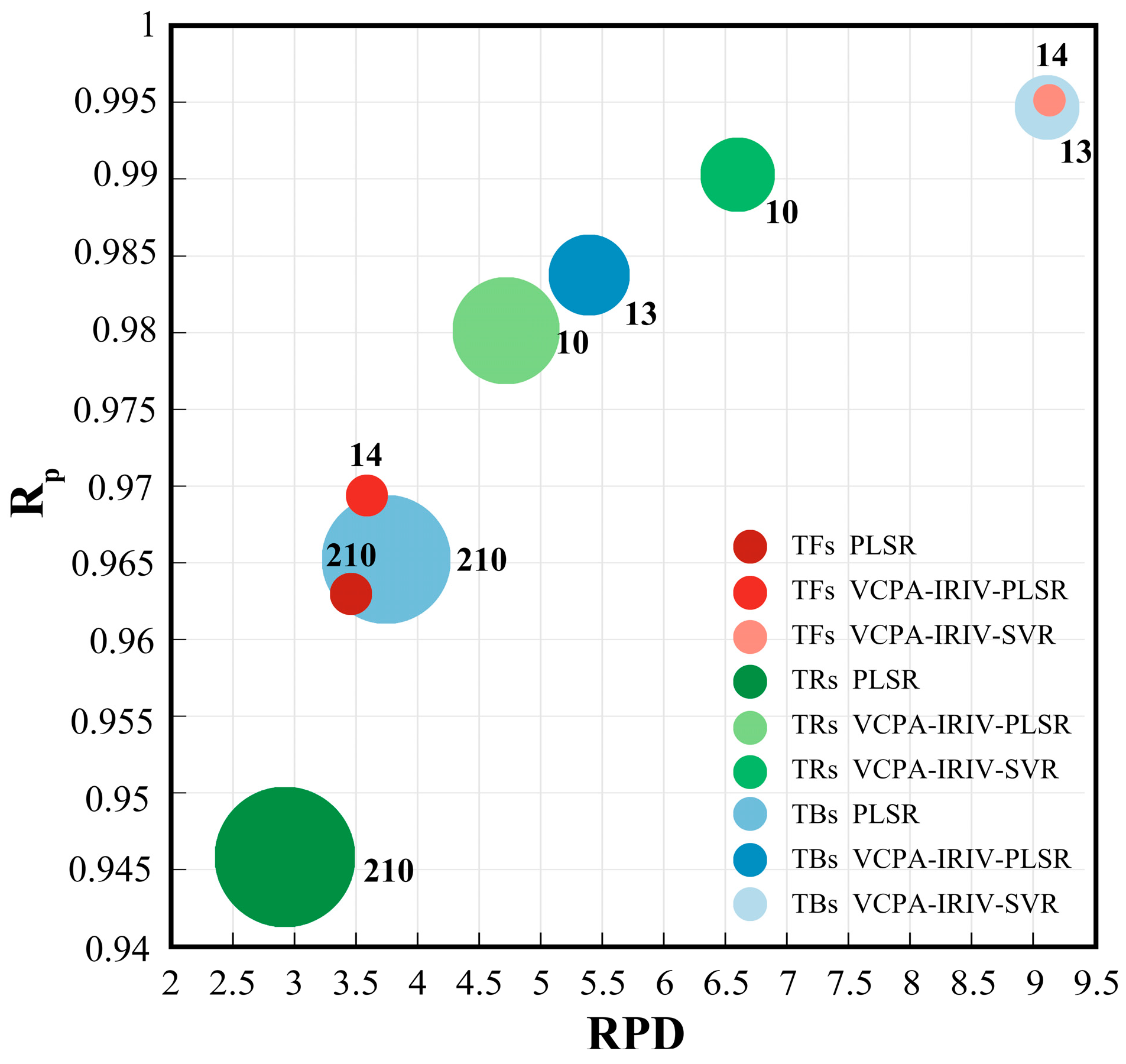 Figure 5. Comparison of the predictive performance of TFs, TRs and TBs based on the full-variable PLSR model, the VCPA-IRIV-PLSR model, and the VCPA-IRIV-SVR model. (Note: red represents TFs, green represents TRs, blue represents TBs, the number on ⚪ represents the number of selected variables, and the radius of ⚪ represents the RMSEP value).