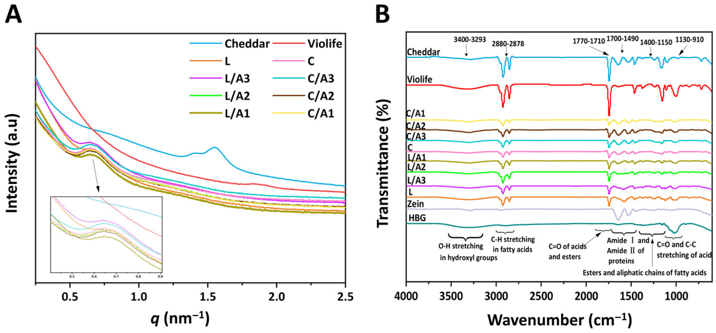 | Secondary Structure (%) | Zein | L | L/A3 | L/A2 | L/A1 | C | C/A3 | C/A2 | C/A1 |