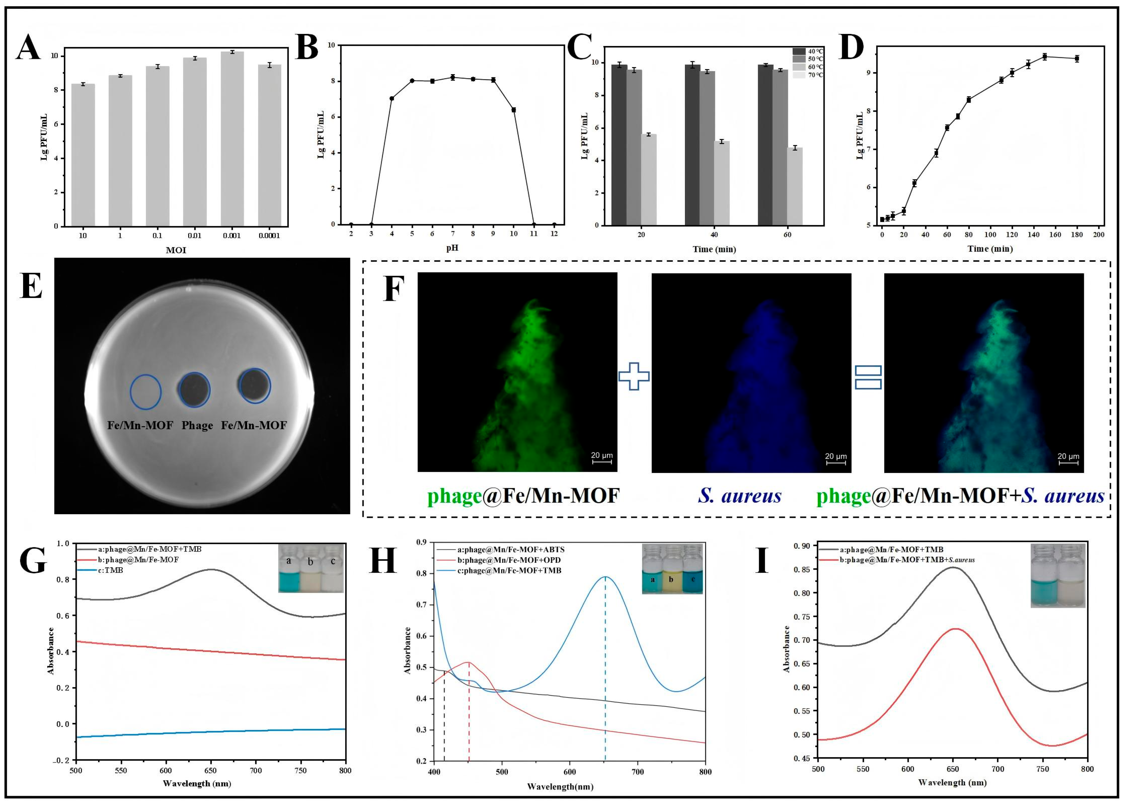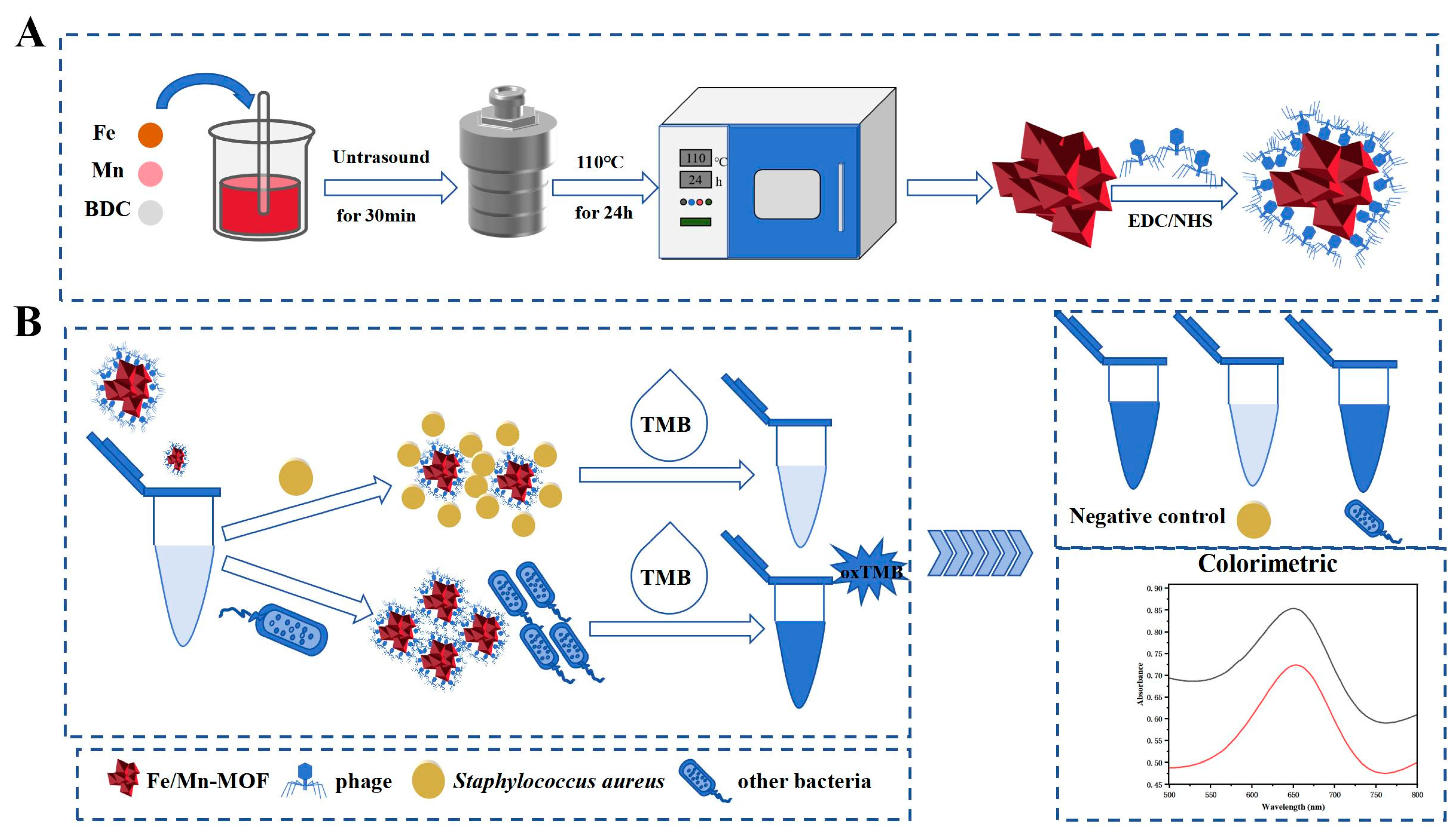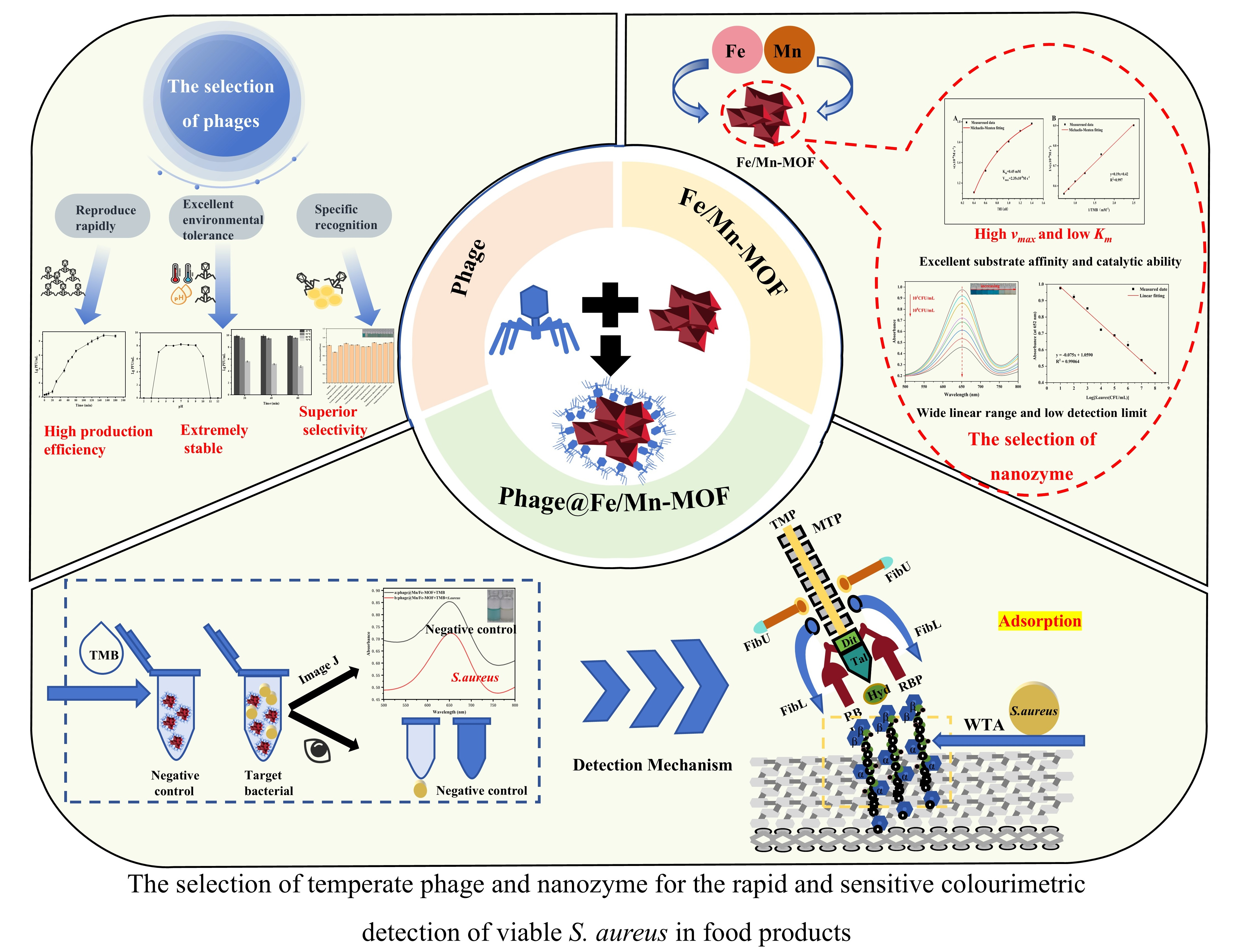 Zhou, W.; Li, W.; Han, Y.; Deng, A.; Li, Y.; Hu, Q.; Yuan, L.; Zhu, G.; Yang, Z. Characterisation of SapYZUs891@Fe/Mn-MOF Provides Insight into the Selection of Temperate Phage and Nanozyme for the Rapid and Sensitive Colourimetric Detection of Viable Staphylococcus aureus in Food Products. Foods 2025, 14, 3726. https://doi.org/10.3390/foods14213726