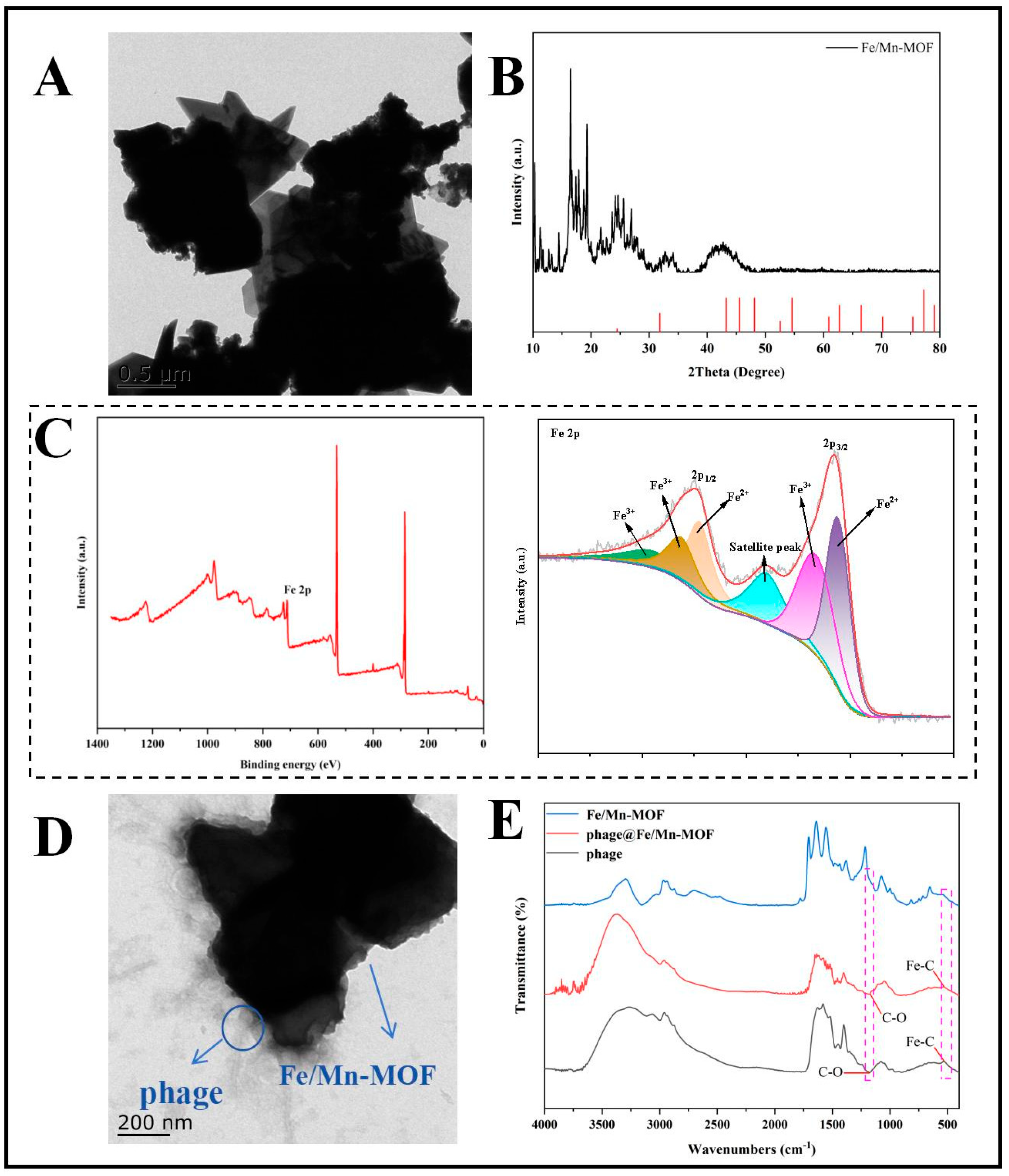 - Gao, L.; Zhang, L.; Yang, J.; Ma, T.; Wang, B.; Yang, H.; Lin, F.; Xu, X.; Yang, Z.Q. Immobilization of a broad host range phage on the peroxidase-like Fe-MOF for colorimetric determination of multiple Salmonella enterica strains in food. Microchim. Acta 2024, 191, 331. [Google Scholar] [CrossRef]