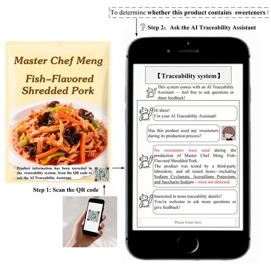 For consumers, traceability information should be tailored to meet their needs and interests as fully as possible [1]. Information that is easy to process and comprehend tends to be more popular [15]. The development of artificial intelligence (AI) provides technical support for overcoming the limitations of traditional traceability system design. Integrating AI into traceability systems is expected to create more innovative application and synergistic effects [3]. AI chatbots are computer programs that utilizes artificial intelligence technology to interact with users online [17]. Using natural language processing and machine learning techniques, AI chatbots can perform tasks such as analyzing information, providing quick responses, and delivering targeted information to users [17,18]. The emergence of AI chatbots has not only changed how consumers obtain information [19] but also enhanced the shopping experience [20]. The development of information and communication technologies has provided technical support for integrating AI with other systems [18]. Currently, AI chatbots have been widely applied in fields such as retailing, marketing, healthcare, education, and tourism [18,20,21]. However, there are still research gaps in the optimization of traceability system design. Inspired by the application of AI chatbots in other fields [22,23,24], this study designs an AI traceability assistant by integrating AI chatbots into traditional traceability systems. The AI traceability assistant enables users to ask questions in natural language and is responsible for retrieving, filtering, and integrating traceability information, thereby enabling the traceability systems to provide users with targeted and customized traceability information.