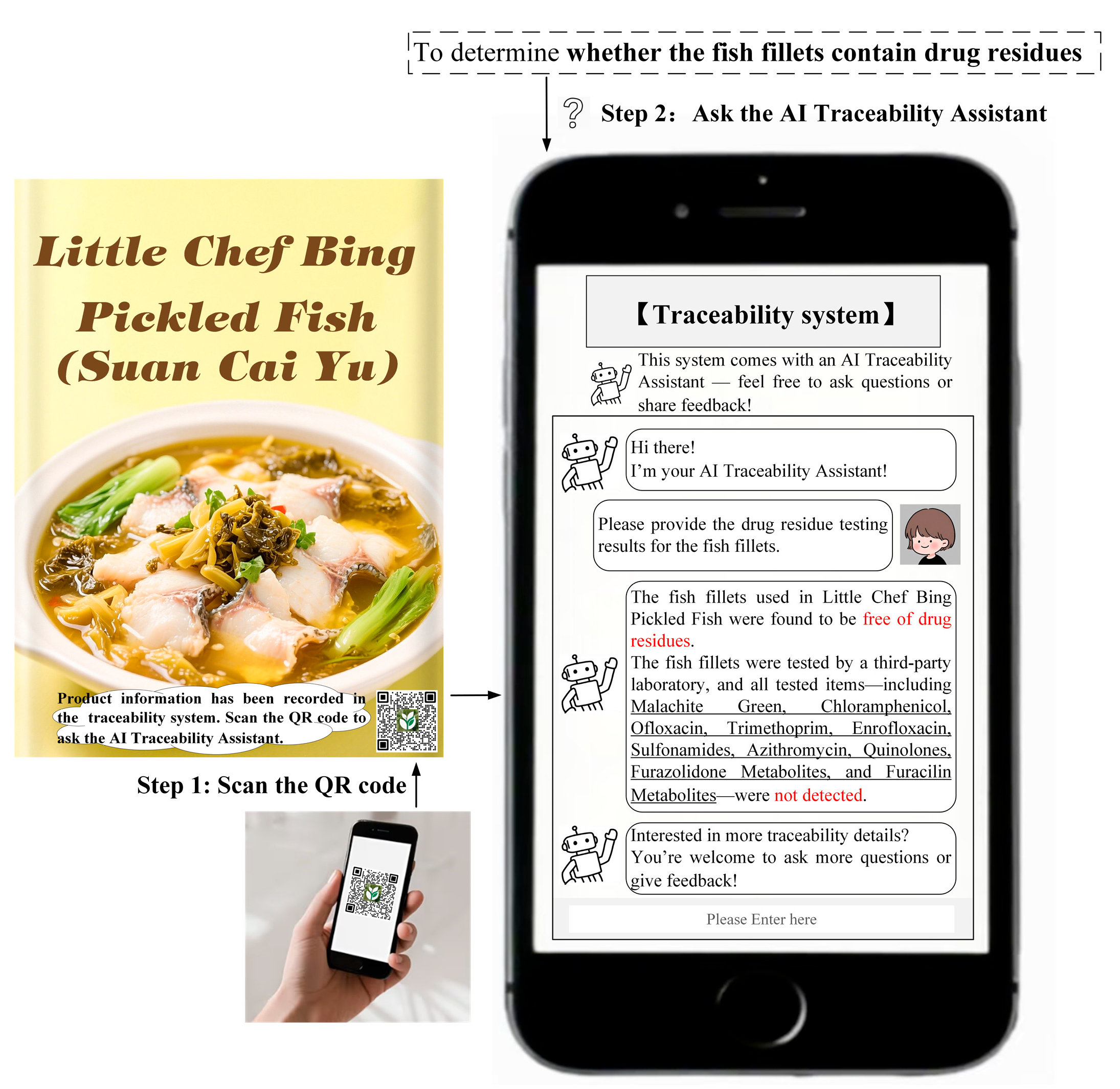 To test the robustness of H1 and H2 and further explore the moderating effect of perceived product risk, Study 3 selected pickled fish (Suan Cai Yu) as the experimental stimulus and drug residues as the traceability task. This study conducted a 2 (Traditional traceability system design vs. AI traceability assistant design) × 2 (Perceived product risk: low vs. high) between-subjects experiment. The experimental manipulation of the traceability system design was the same as in Study 1, and the manipulation of perceived product risk was adapted from the experimental design of Mollenkopf et al. [67]. The detailed experimental procedure of Study 3 is provided in Appendix B.3. The procedures for obtaining traceability information through the traditional traceability system or AI traceability assistant are shown in Figure 5 and Figure 6, respectively. A total of 400 participants were recruited, and randomly assigned to one of the four groups.