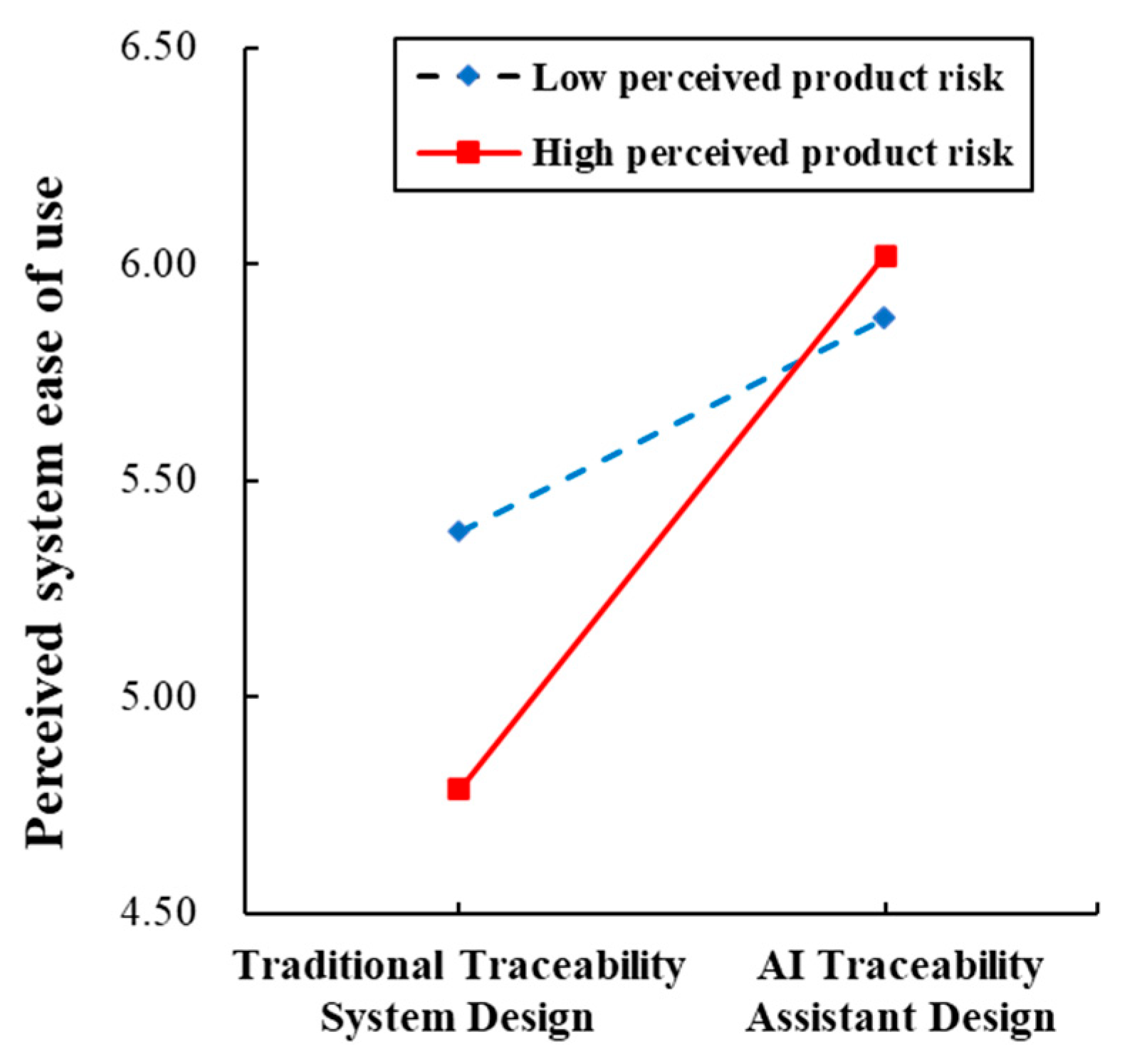 To examine the moderating role of perceived product risk, study 3 employed PROCESS Model 7 to conduct a bootstrap analysis (5000 resamples, 95% confidence interval). Demographic variables (gender, age, education, and income), consumption experience, food familiarity, and food preference were included as control variables. As shown in Table 4, compared with the traditional traceability system, the AI traceability assistant significantly improves perceived system ease of use (), and this effect is stronger under conditions of high perceived product risk (see Figure 7). This indicates that perceived product risk amplifies the positive effect of the AI traceability assistant design on perceived system ease of use ().