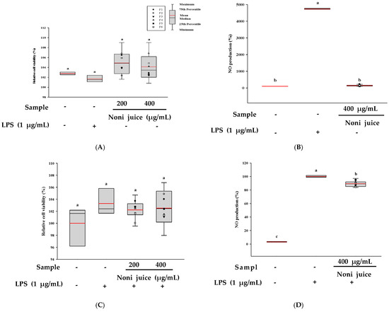 3.6. Evaluation of Immunoenhancing and Anti-Inflammatory Effects of Noni Juice in RAW 264.7 Cells