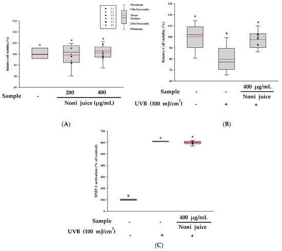 3.7. Cytoprotective Properties of Noni Juice on HDF Cells Exposed to UVB Irradiation