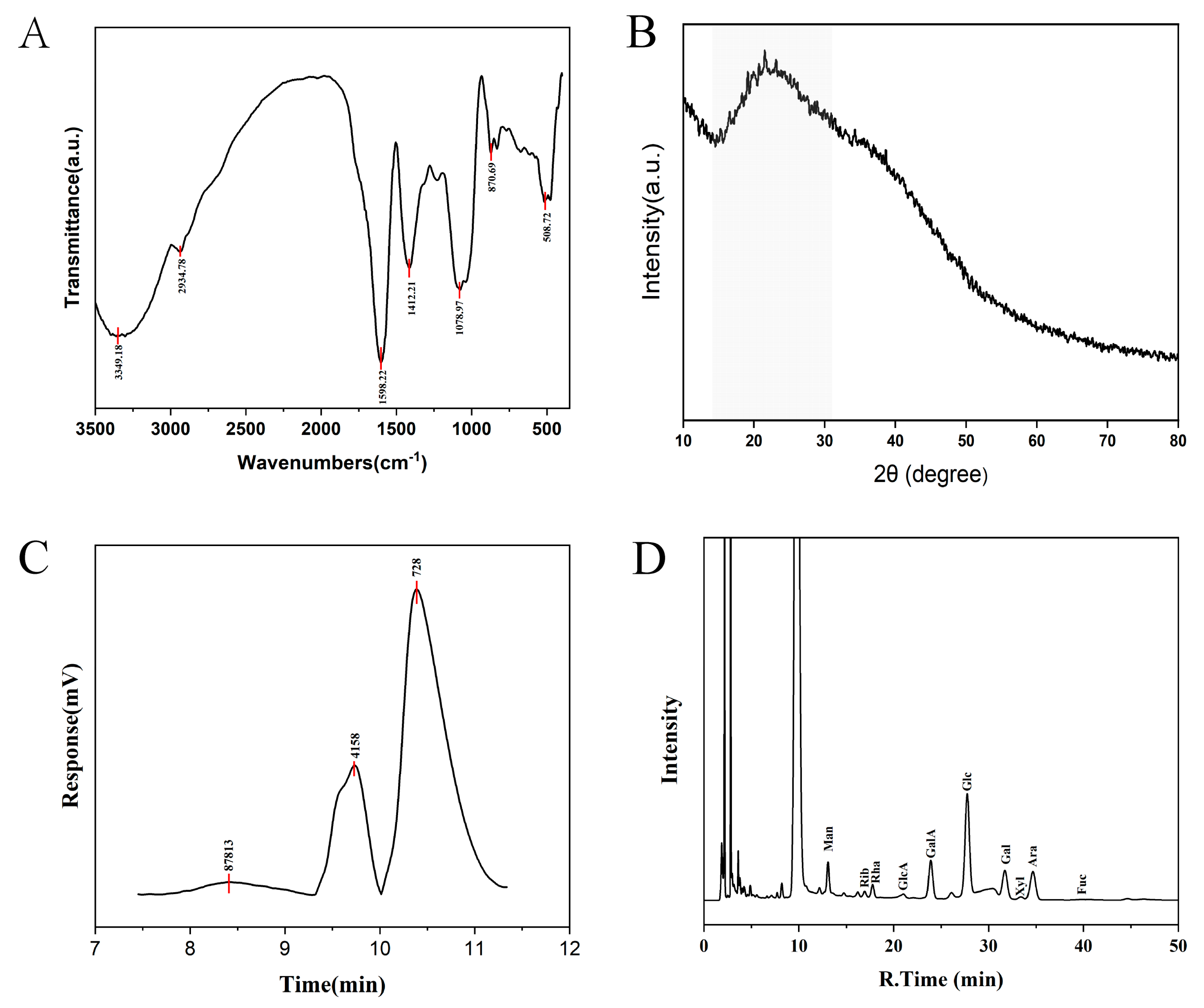 The monosaccharide composition was detected using Shimadzu LC-20AD (Japan). Column: Xtimate C18 4.6 × 200 mm 5 um; mobile phase: 0.05 M potassium dihydrogen phosphate solution; injection volume: 20 μL; column temperature: 30 °C; flow rate: 1.0 mL/min.
