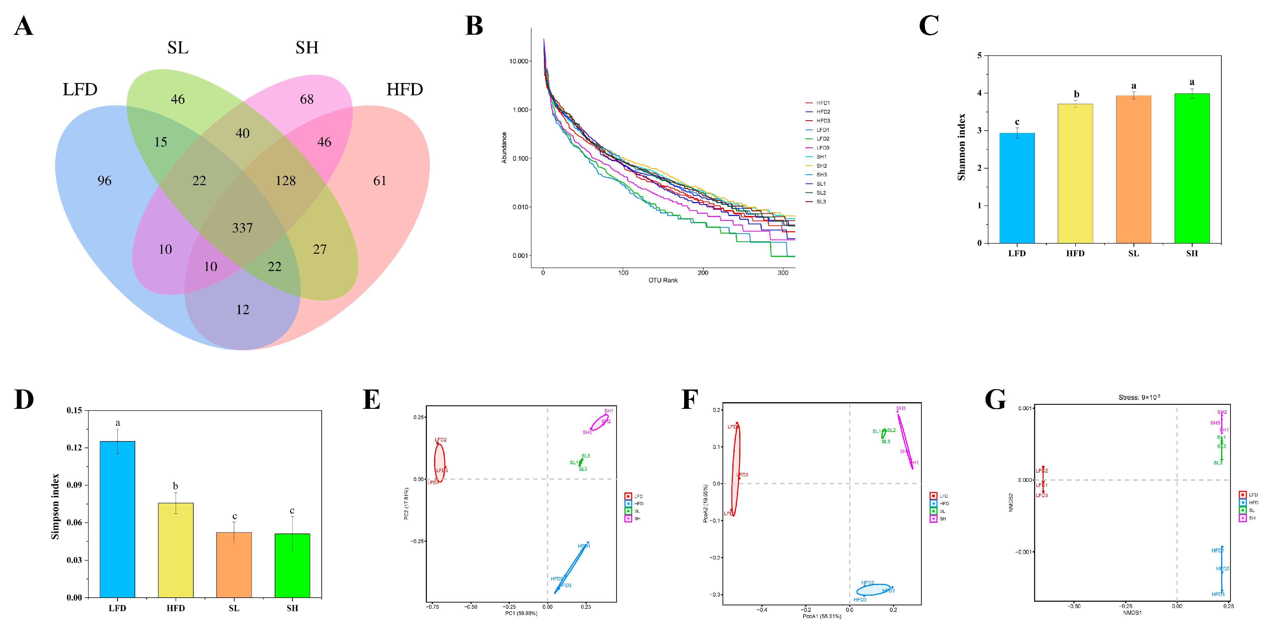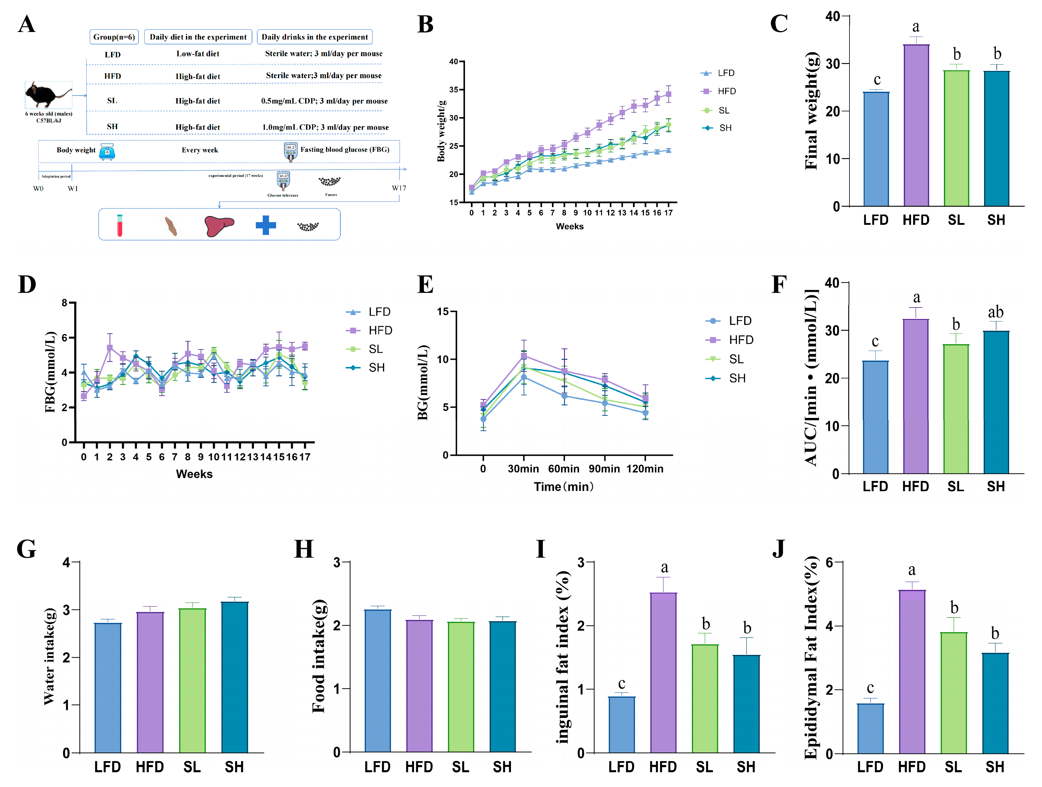 Specific Pathogen-Free (SPF) male C57BL/6J mice (6-week-old) were obtained from Henan Skibbes Biotechnology Co., Ltd. (Anyang, Henan, China). The mice were housed in the animal facility of Yunnan Agricultural University under controlled conditions (12 h light/12 h dark cycle; 22–24 °C) in individually ventilated cages (IVC). All animal procedures complied with the Guide for the Care and Use of Laboratory Animals and were approved by the Life Science Ethics Committee of Yunnan Agricultural University (Approval No. 202502002). After a 1-week acclimation, the mice were randomly assigned to four groups (n = 6/group): (i) low-fat diet control (LFD), fed standard chow and given sterile water; (ii) high-fat diet model (HFD), fed an HFD and given sterile water; (iii) low-dose CDP (SL), HFD-fed and given Coral dealbatus crude polysaccharide (CDP) at 0.5 mg/mL in drinking water; and (iv) high-dose CDP (SH), HFD-fed and given CDP at 1.0 mg/mL in drinking water. CDP or sterile water was provided ad libitum via the drinking water system. Body weight and fasting blood glucose (FBG) were measured weekly. An oral glucose tolerance test (OGTT) was performed at week 15. At week 16, fecal samples were collected and stored at −80 °C for subsequent analyses. At the end of week 17, mice were euthanized. Blood and key organs (e.g., liver, adipose tissue) were collected for biochemical assays and histopathological examination. The experimental timeline is summarized in