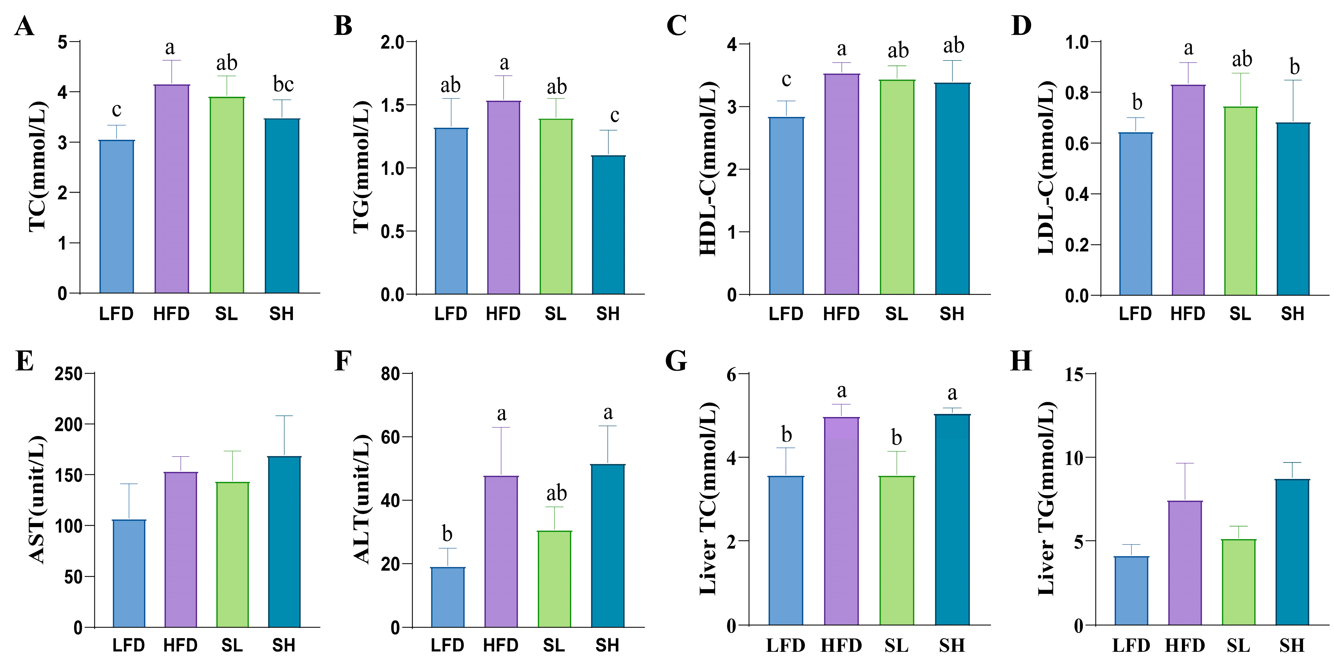 After collection, whole blood was allowed to stand at 4 °C for 1 h and was then centrifuged at 10,000 rpm for 10 min in a refrigerated centrifuge. The serum was collected and stored at −80 °C until analysis. Serum TC, TG, HDL-C, LDL-C, ALT, and AST were measured using commercial assay kits according to the manufacturer’s instructions.