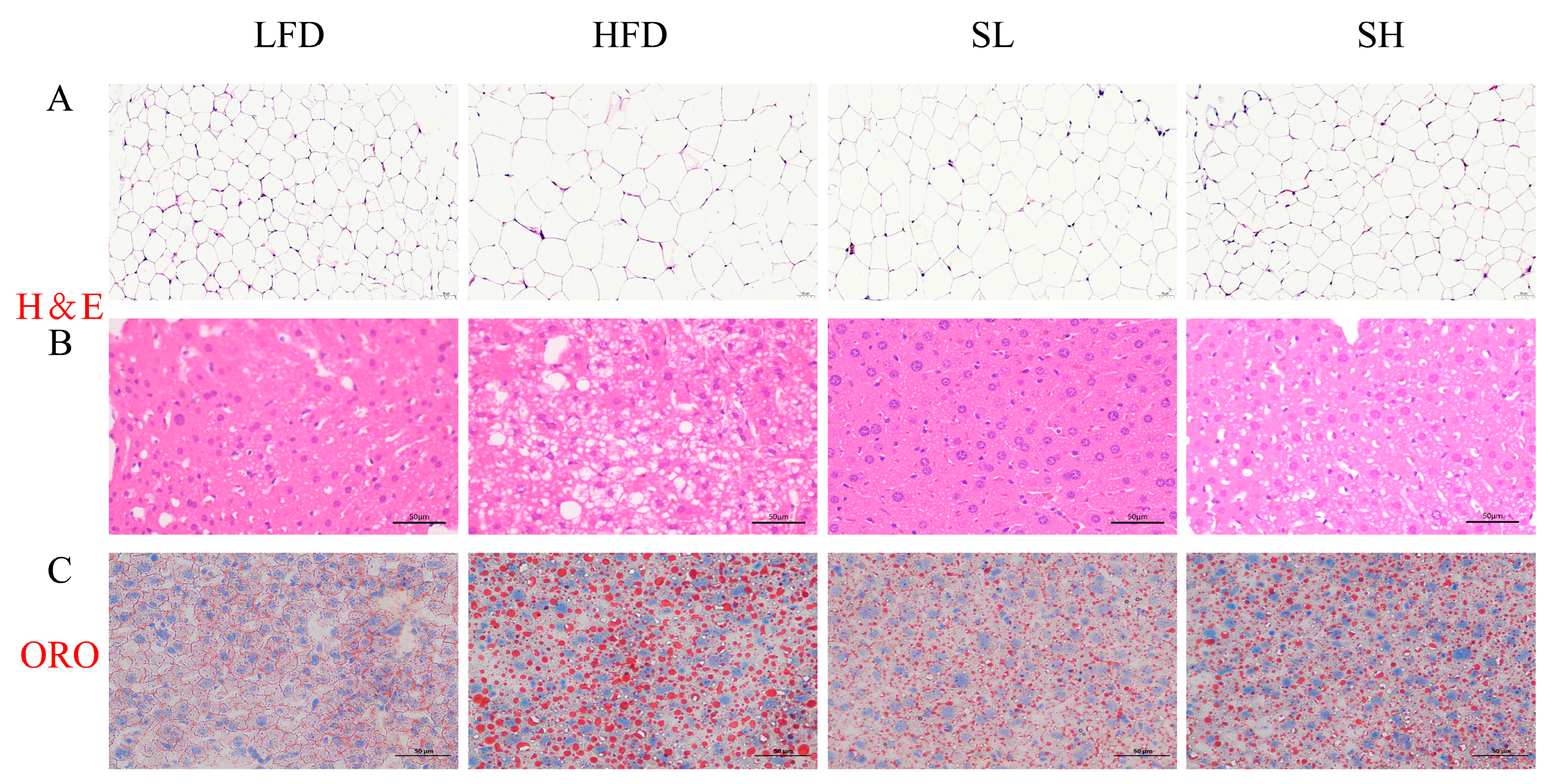 Histological assessment with hematoxylin and eosin (H&E) and Oil Red O staining revealed alterations characteristic of diet-induced obesity. H&E delineates tissue architecture and cellular pathology, whereas Oil Red O specifically labels neutral lipid deposits (e.g., lipid droplets). Diet-induced obesity is associated with adipocyte hypertrophy that facilitates excess energy storage and is linked to insulin resistance and local inflammation [