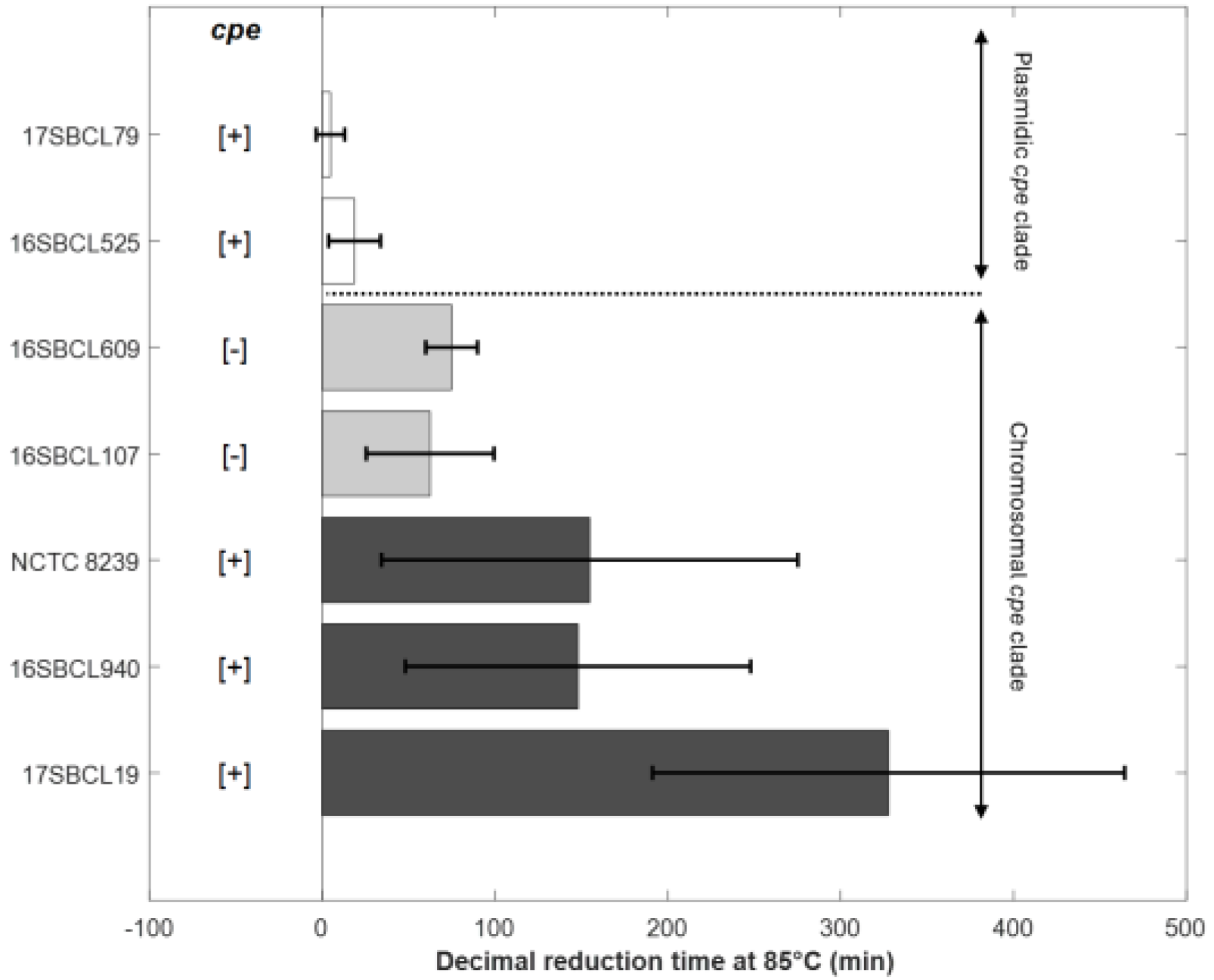 | NCTC8239 | F | (+) | Chromosome | Food (salted beef) Food poisoning | 1952 | The United Kingdom | 43.3 | D100 °C (min) (a) = 53.3 ± 10.03 [27] | |||