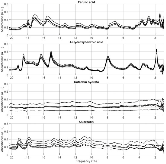 Our study builds upon previous research on the characterization of phenolic compounds (PCs) using vibrational spectroscopy techniques such as Raman and mid-infrared (MIR) spectroscopy [6,14]. The aim was to investigate their spectral characteristics in a relatively under-investigated spectral region. Spectral features of PC standards, including phenolic acids and flavonoids, were examined using FTIR spectroscopy between 0.90 and 20.35 THz (approx. 30–679 cm−1), thus encompassing both the THz and far-infrared (FIR) ranges. The repeatability of the spectra was evaluated through successive measurements, while time-based reproducibility was assessed by monitoring spectral stability over extended periods. A spectral database was constructed, and the feasibility of discriminating between different PC families or classes was explored. This approach based on pure standards represents a first step towards more practical applications aiming at characterizing real food products. These latter would certainly imply effects from interactions between PCs and food matrices, and water in particular. Here, we propose a more fundamental exploration of the interaction between PCs and radiation in the THz range.