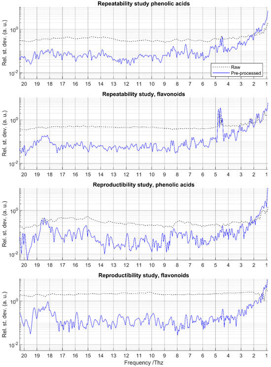 The mean relative standard deviations (RSD) of raw and pre-processed spectra for repeatability and reproducibility assessments are shown in Figure 4 for phenolic acids and flavonoids, respectively. In both studies, raw spectra exhibited substantially higher RSDs than pre-processed spectra, mainly due to vertical baseline shifts. After pre-processing, RSD values were consistently low (≈0.1) except in three specific regions.