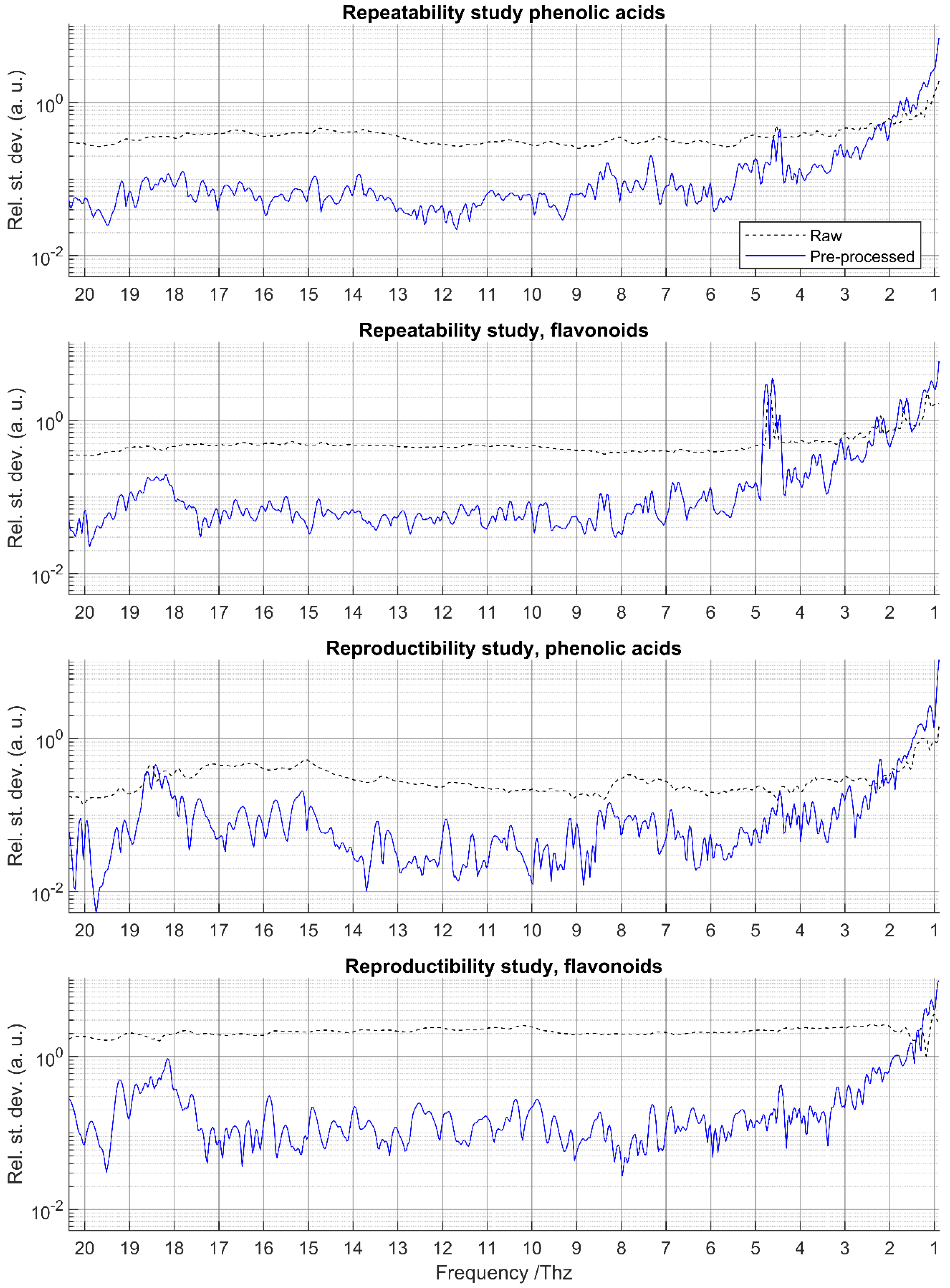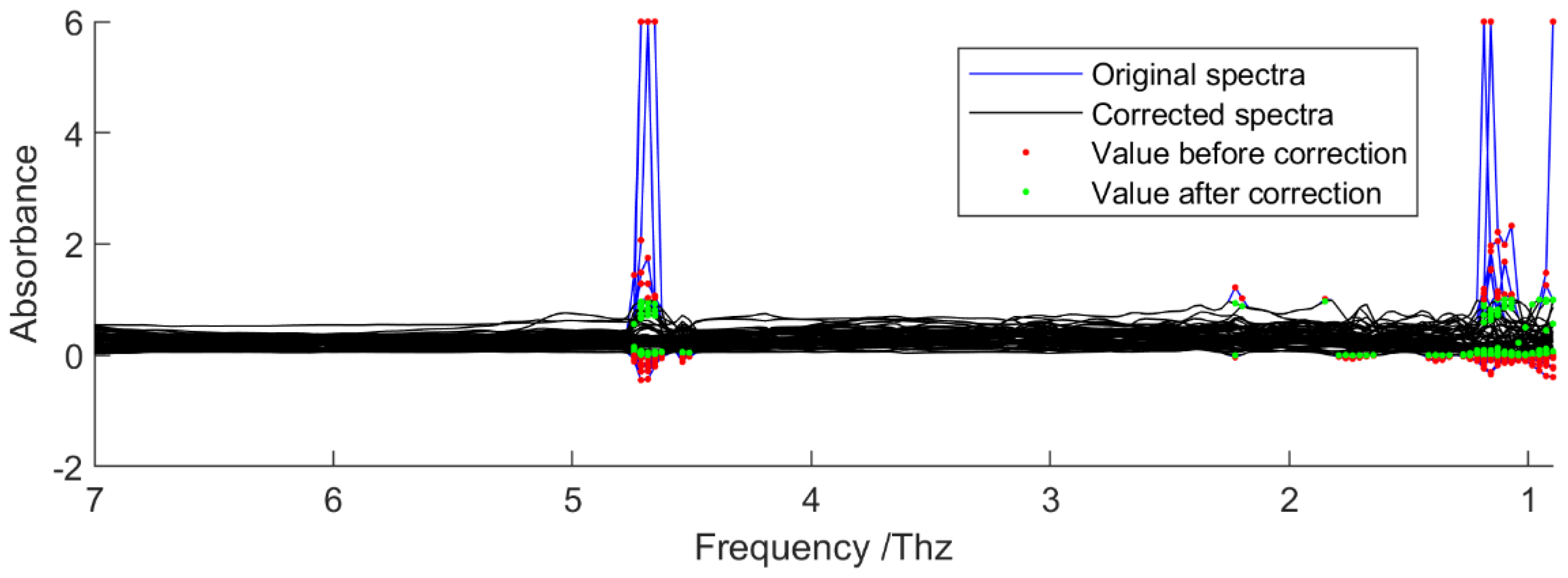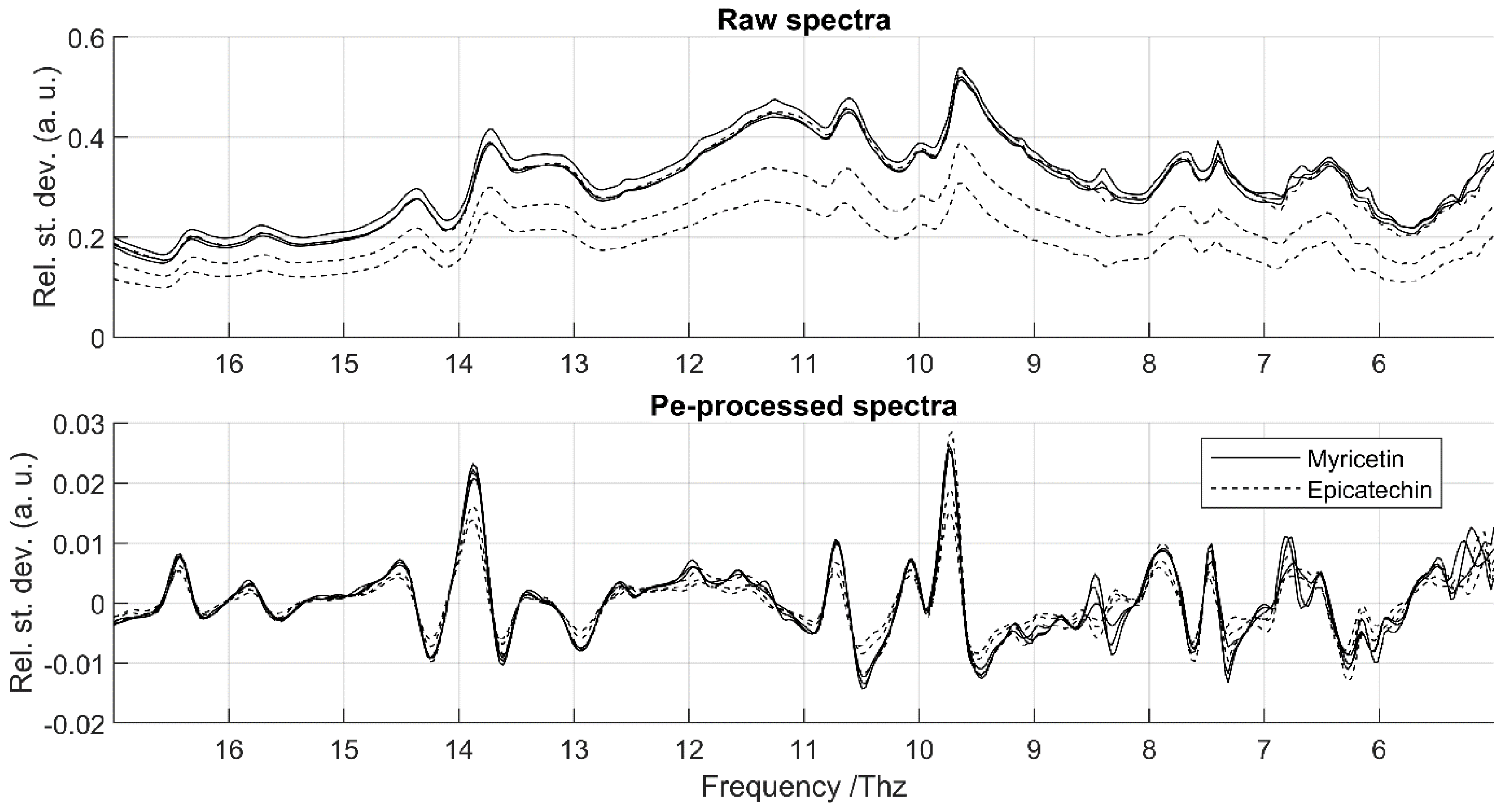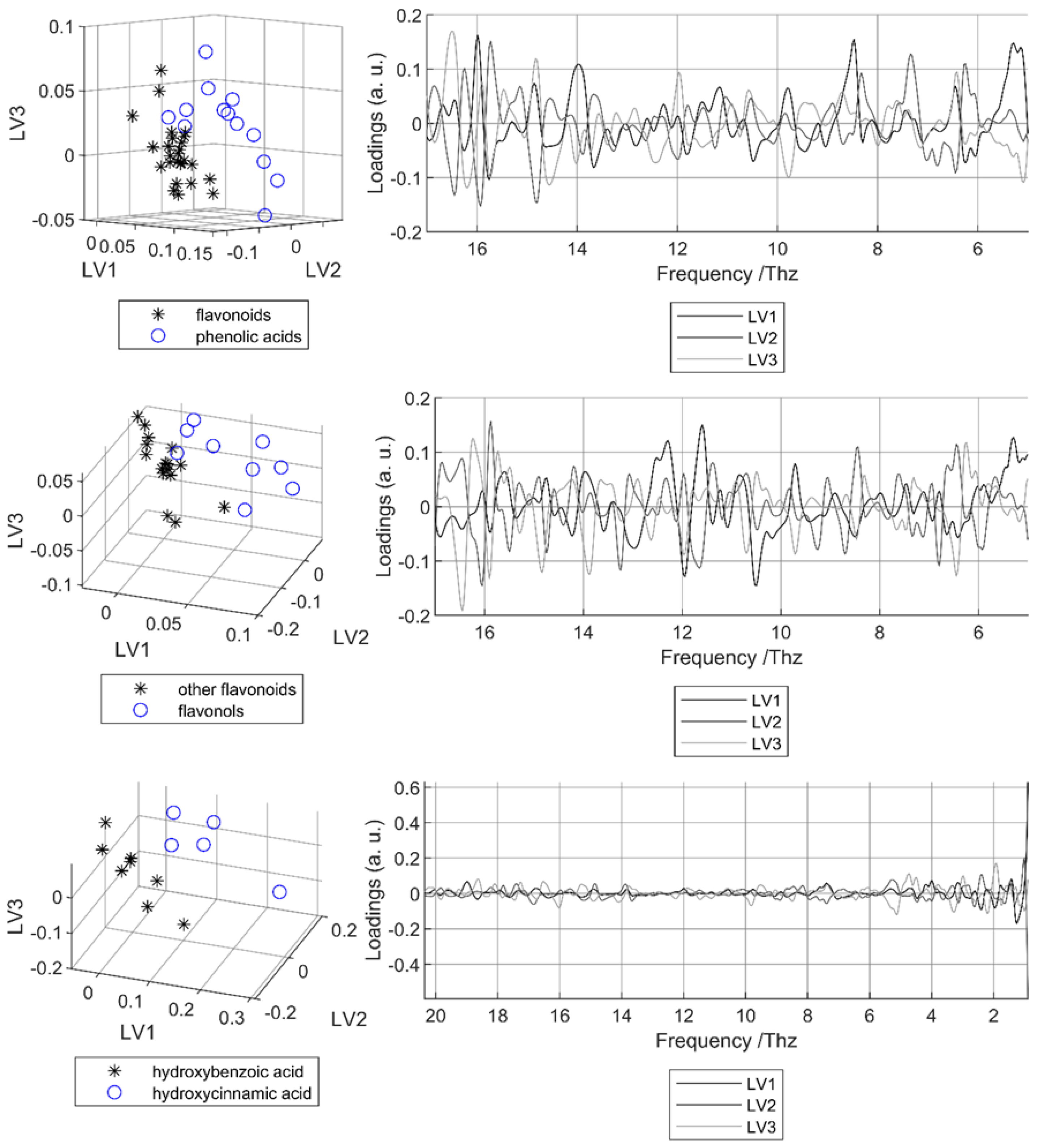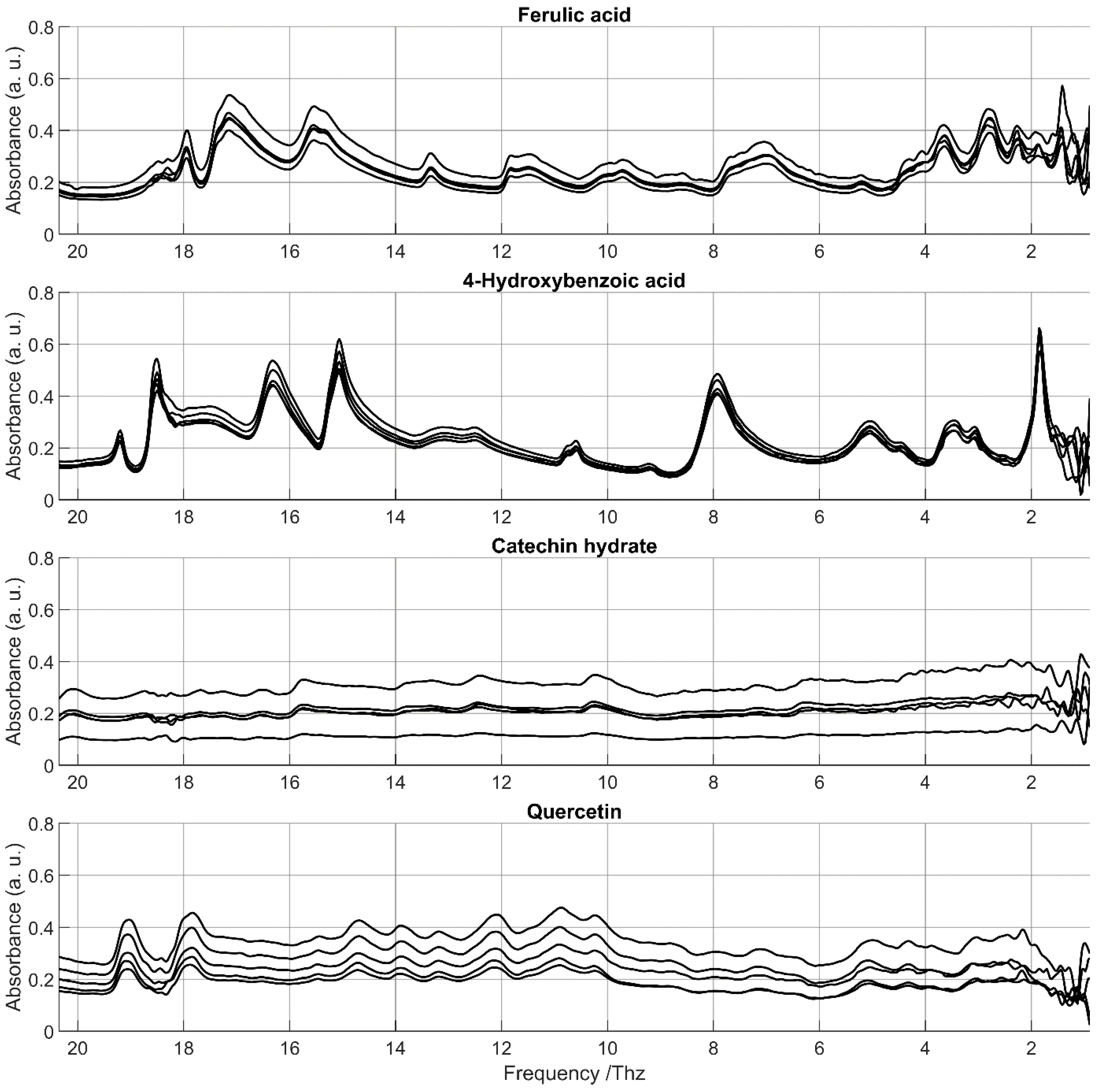 - Yan, L.; Liu, C.; Qu, H.; Liu, W.; Zhang, Y.; Yang, J.; Zheng, L. Discrimination and Measurements of Three Flavonols with Similar Structure Using Terahertz Spectroscopy and Chemometrics. J. Infrared Millim. Terahertz Waves 2018, 39, 492–504. [Google Scholar] [CrossRef]