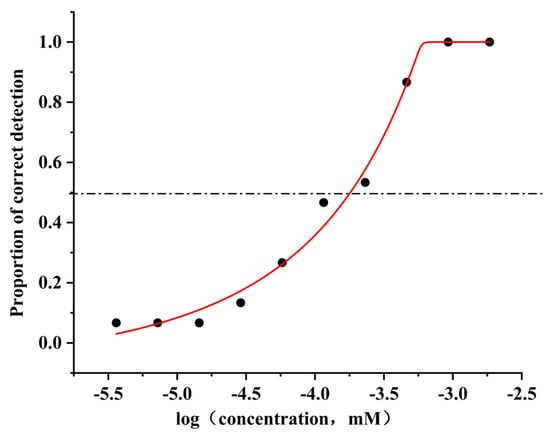Among the diverse array of food-flavoring agents, 4-methylphenol stands out due to its unique and distinctive odor characteristics. The diluted solution of 4-methylphenol (0.2 µL/L) has characteristic odors that can be likened to fertilizers, stables, tobacco, and leather, which is consistent with its descriptions in the literature [17,40]. The results of the odor detection threshold evaluation of 4-methylphenol by 15 panelists are shown in Figure 1. It can be concluded that its detection threshold is 0.15 μM when the proportion of correct detections is 0.5. A review of the relevant literature indicates that the detection threshold of 4-methylphenol in water ranges from 0.025 μM to 1.85 μM [41,42]. The detection threshold determined in this work is consistent with the ranges reported in the literature, reinforcing the validity of these findings.