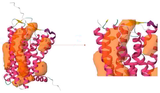 hOR9Q2 is an olfactory receptor protein with 314 amino acid residues and is characterized by the presence of seven transmembrane (TM) helical domains. As shown in Figure 2, five binding pockets were predicted using the computational software, which are located in (1) TM3, TM4, TM5, and TM6; (2) TM2, TM3, TM6, and TM7; (3) TM1 and TM2; (4) TM1 and TM7; and (5) TM4. It is noteworthy that pocket 1 achieved the highest prediction score among the identified pockets. As a result, pocket 1 was used as the docking box for molecular docking in this work.