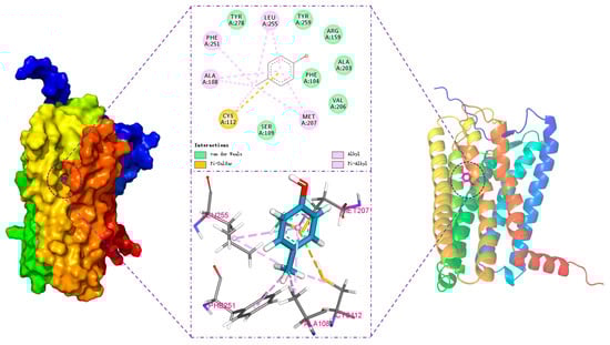 The interaction between the odorant and olfactory receptor was analyzed in the designated docking box, and the results are shown in Figure 3. This figure illustrates the optimal binding conformation of 4-methylphenol in hOR9Q2 and highlights the potential existence of five key binding sites in the 4-methylphenol-hOR9Q2 complex, with the following positions: (1) TM3: Ala108, Cys112; (2) TM5: Met207; and (3) TM6: Phe251, Leu255.