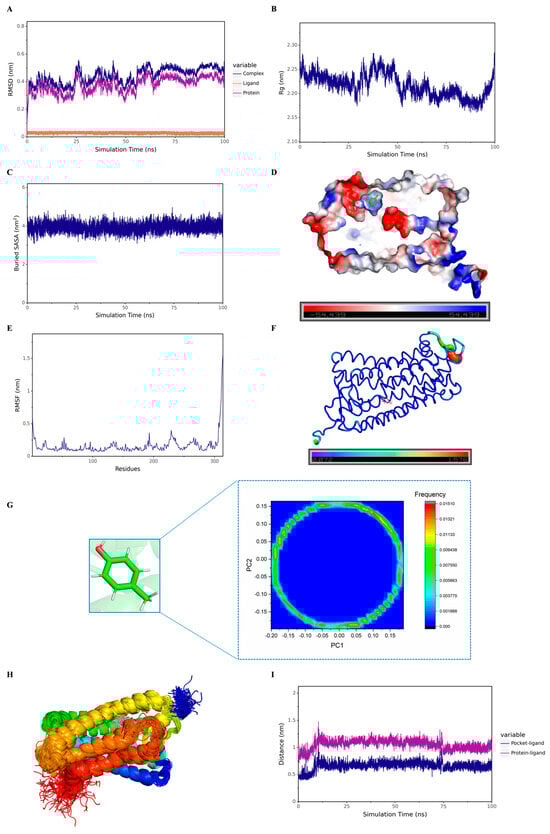 Stability analysis results of the hOR9Q2-4-methylphenol complex. (A): The RMSD of the complex, proteins and small molecule ligands. (B): The Rg of the complex, and the ordinate is Rg (nm), and the abscissa is time (ns). (C): The buried surface area of interaction between small molecules and proteins (Buried SASA), where the ordinate is SASA (nm2) and the abscissa is time (ns). (D): The surface electrostatic potential of small molecule binding proteins (kcal/mol); (E): The RMSF of the protein in the complex, where the ordinate is RMSF (nm) and the abscissa is residue; (F): B-Factor (nm). (G): Protein binding state structure and PCA. (H): Simulated conformation overlaying. (I): The distance (nm) between the protein and the binding site of small molecules (Dock site–ligand), where and the abscissa is time (ns).