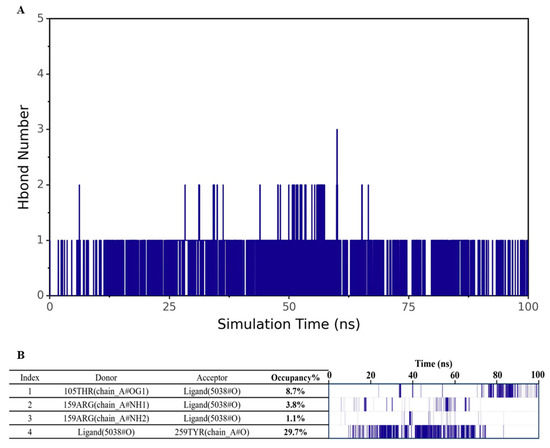 Hydrogen bonds, as a key interaction force in protein-ligand binding, are closely related to electrostatic interactions and can be used as an important indicator to evaluate the strength of electrostatic complementarity at the binding interface [44]. To systematically assess the hydrogen bonding characteristics between 4-methylphenol and hOR9Q2, the hydrogen bond quantity and formation frequency were analyzed separately. As shown in Figure 5A, the number of hydrogen bonds formed between 4-methylphenol and hOR9Q2 throughout the MD simulation was relatively small, fluctuating mainly between 0 and 1, which indicated that hydrogen bonds are not the dominant force in the binding of this complex. To further explore the stability and contribution of hydrogen bonds, a hydrogen bond frequency analysis was conducted. As shown in Figure 5B, although hydrogen bond interactions can be detected, their formation frequency is generally low, and the corresponding hydrogen bond occupancy is also relatively limited. No stable and frequent hydrogen bonds were found with any specific residue. For example, Tyr259 exhibited a hydrogen bond occupancy of only 29.7%, indicating that this interaction was relatively unstable and insufficient to play a dominant role in binding. Although this residue possessed the potential to form hydrogen bonds, its weak electrostatic contribution (−0.204 kcal/mol) failed to compensate for the high desolvation penalty (+5.024 kcal/mol). The net binding free energy contribution of residue Tyr259 (−5.263 ± 0.332 kcal/mol) originated primarily from strong van der Waals interactions (−9.477 kcal/mol), which not only offset the desolvation cost but also served as the primary driving force for binding—a conclusion that was corroborated by the results presented in Figure 3.