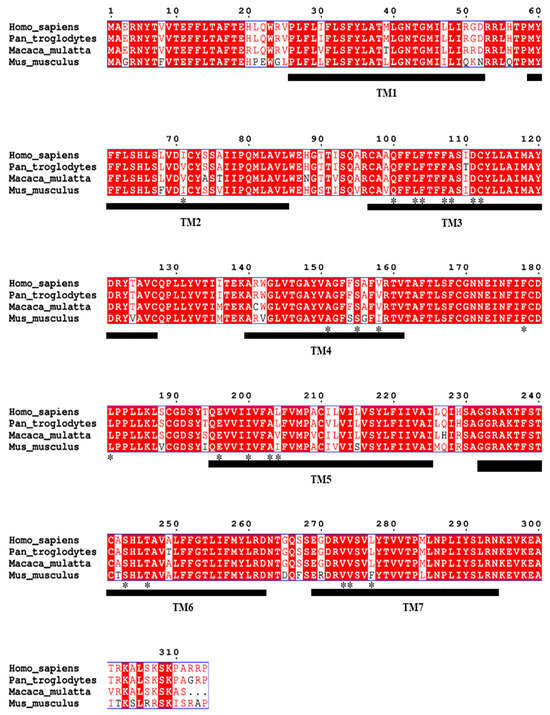 Sequence alignment of OR9Q2 in different species: Pan troglodytes, Mus musculus, Macaca mulatta, and Homo sapiens. The TM area is represented by a black horizontal line. The 22 amino acid positions predicted by Man et al. are marked with *, while the different positions of amino acid residues are marked with blank highlights.