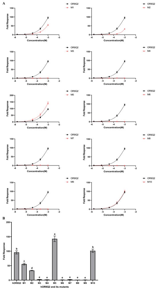 Response of hOR9Q2 to 4-methylphenol after mutation. (A) The concentration–response relationships between hOR9Q2 and its mutants to 4-methylphenol, and displayed as mean ± SD (n = 3); (B) the results of 4-methylphenol (1000 μM) activating the corresponding olfactory receptors. M1–M10 represent mutants of hOR9Q2 in which the 71st, 108th, 112th, 158th, 204th, 207th, 251st, 255th, 259th, and 277th amino acids of the receptor are mutated to Val, Gly, Ala, Ile, Val, Ala, Ala, Ala, Ala and Phe, respectively. Fold response was calculated relative to a control sample containing vehicle alone. Significance analysis was performed on the response results and the different letters (a, b, c, d, and e) indicate significant differences at the p < 0.05 level.