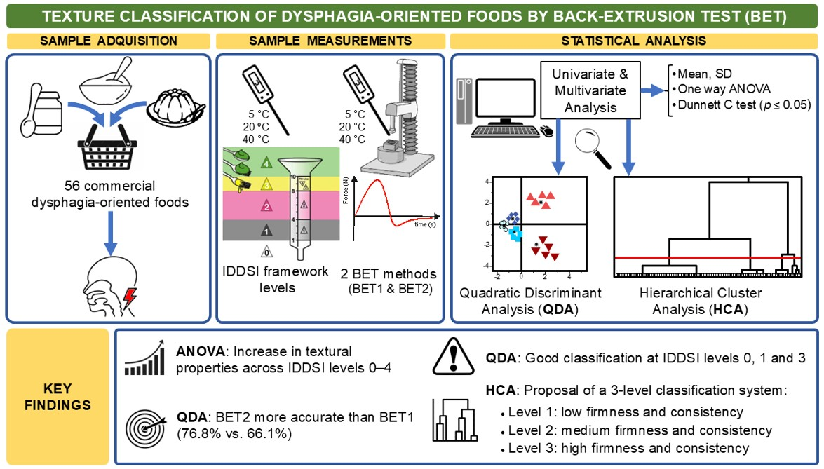 10] provided a comprehensive evaluation of ten commercial pureed foods intended for people with OD. Their results demonstrated significant variability in texture, nutritional composition, and sensory attributes among commercially available samples, underscoring the absence of standardization in textural characteristics from an instrumental standpoint, as well as inconsistencies in the methodologies used for their assessment. Previous studies have shown that the Back-Extrusion Test (BET) is a fast, and objective method for measuring textural properties of foods. However, while BET is well-established for certain applications, its reliability and reproducibility for classifying commercial TMFs has not yet been explored [