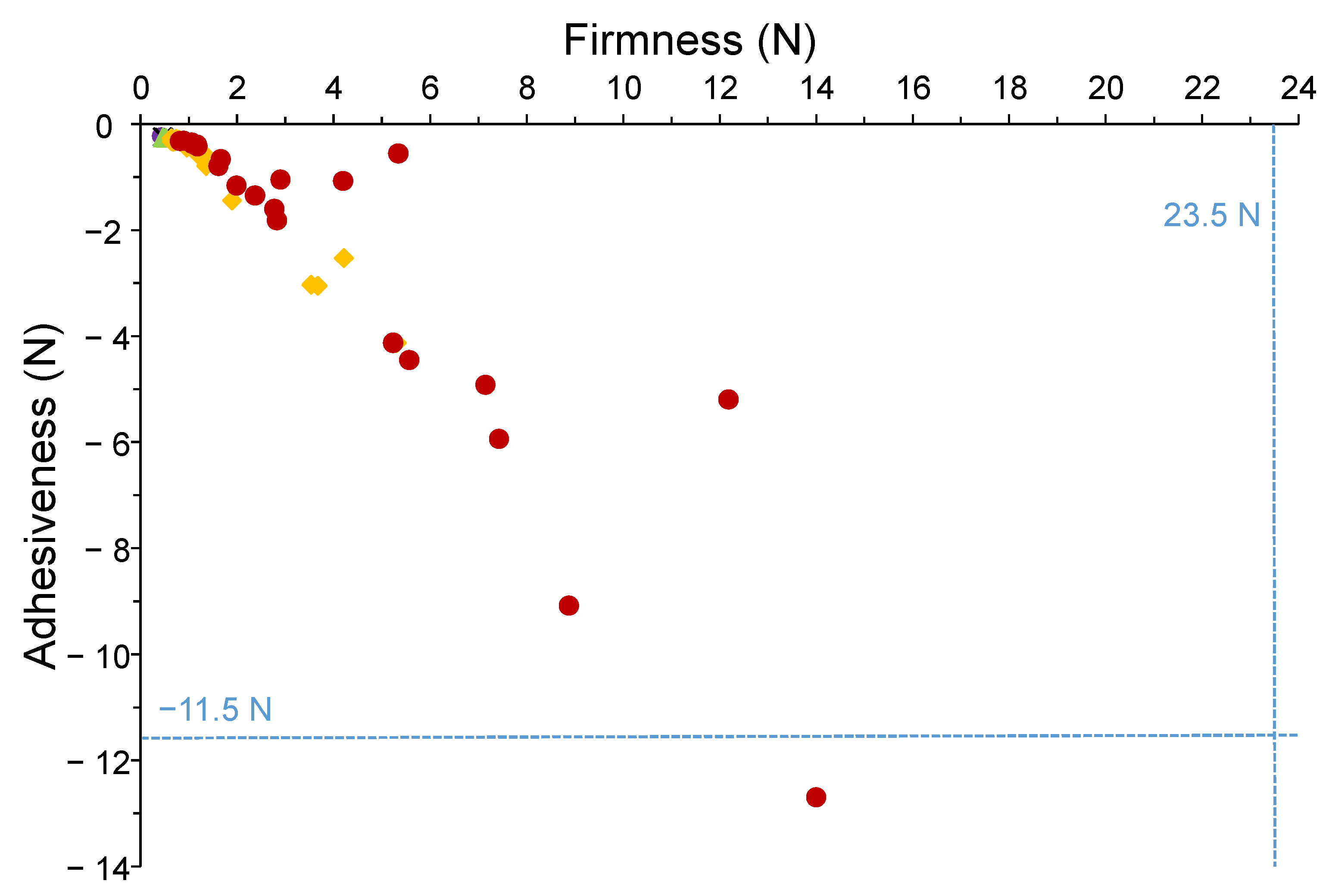 13]. The matrix heterogeneity, including the presence of dietary fiber or protein fragments, may explain the mismatches. These components may partially obstruct flow in the syringe test; however, they provide less resistance to extrusion in BET, which is associated with reduced cohesiveness.