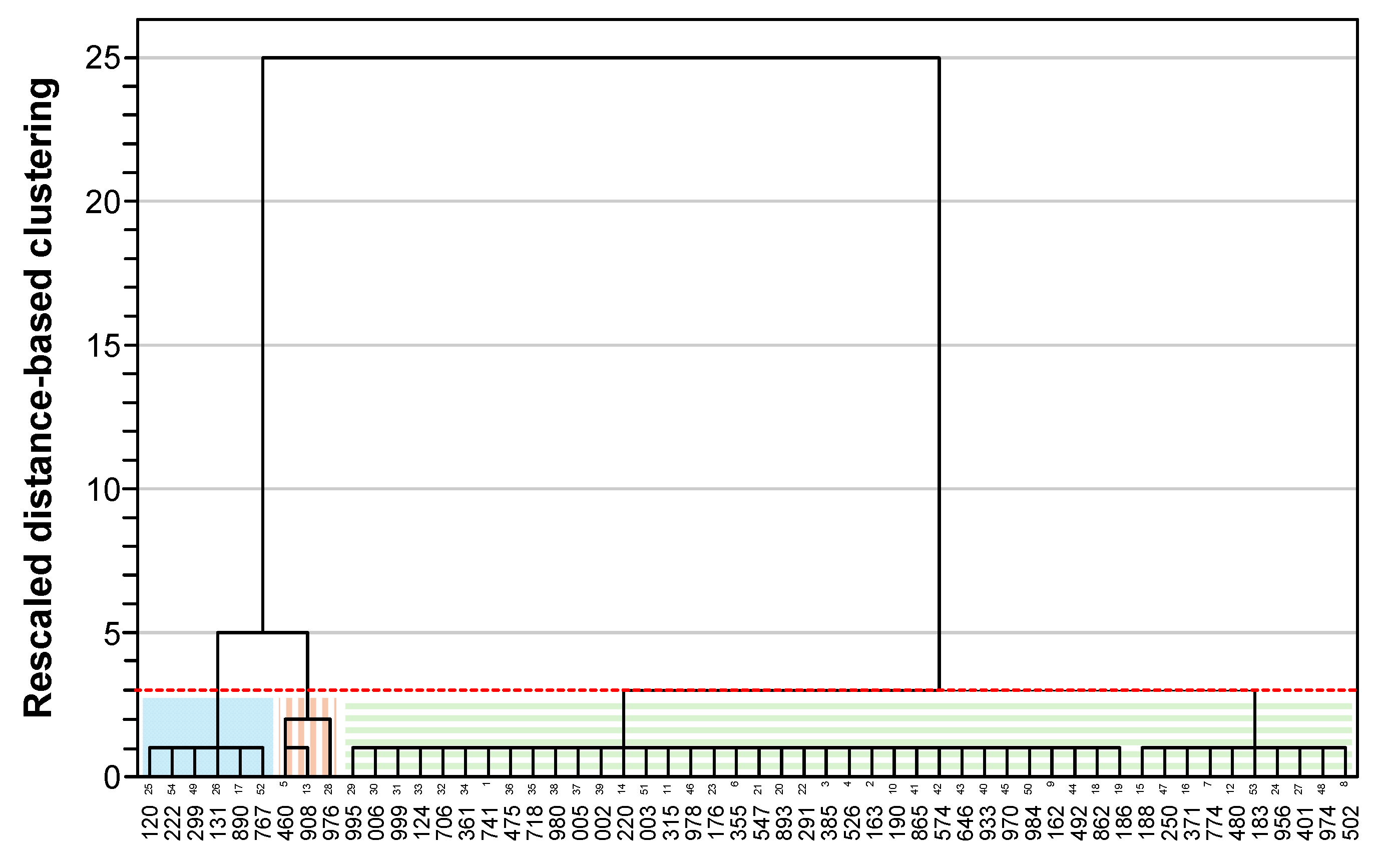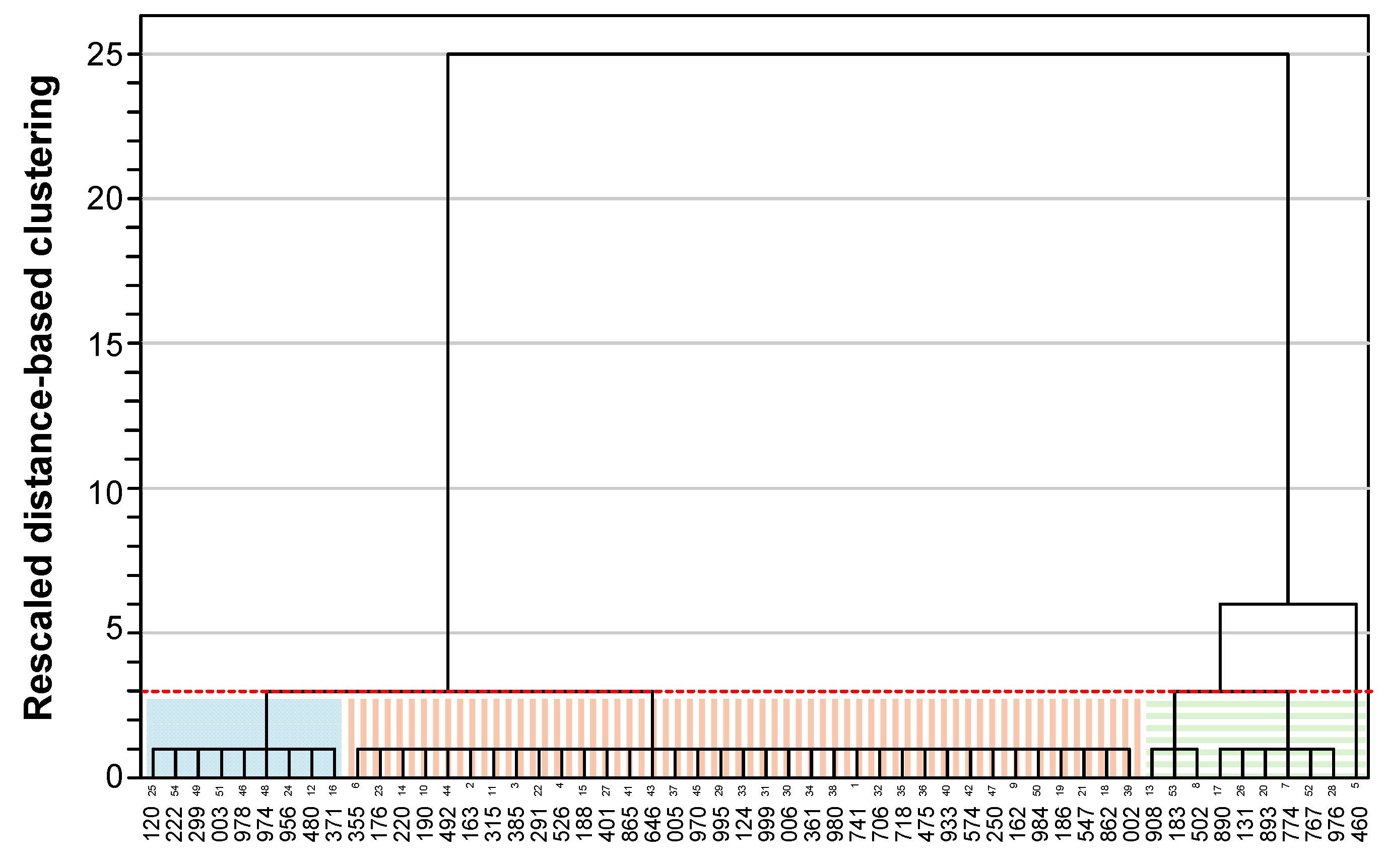 Figure 3 depicts the three clusters identified by the BET2 method. The first cluster comprised 35 samples with consistency values ranging from 2.0 to 11.9 N × s, including all samples from IDDSI level 0–2, 15 from level 3 and 8 from level 4. The second cluster grouped 9 samples with consistency values between 13.2 and 24.0 N × s (6 from IDDSI level 3 and 3 from level 4), and the third cluster with 10 samples with consistency values ranging from 31.6 to 59.3 N × s, all belonging to IDDSI level 4.