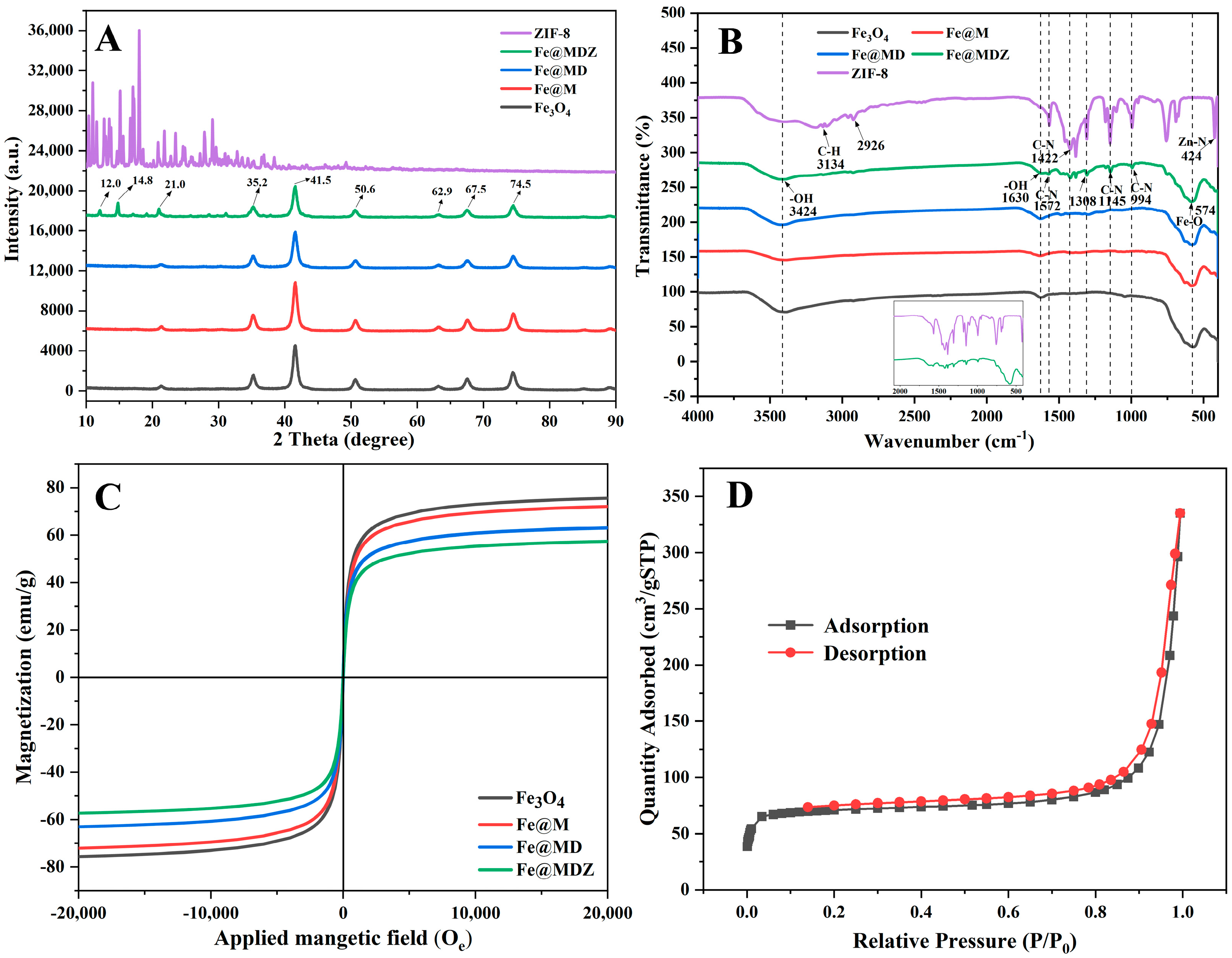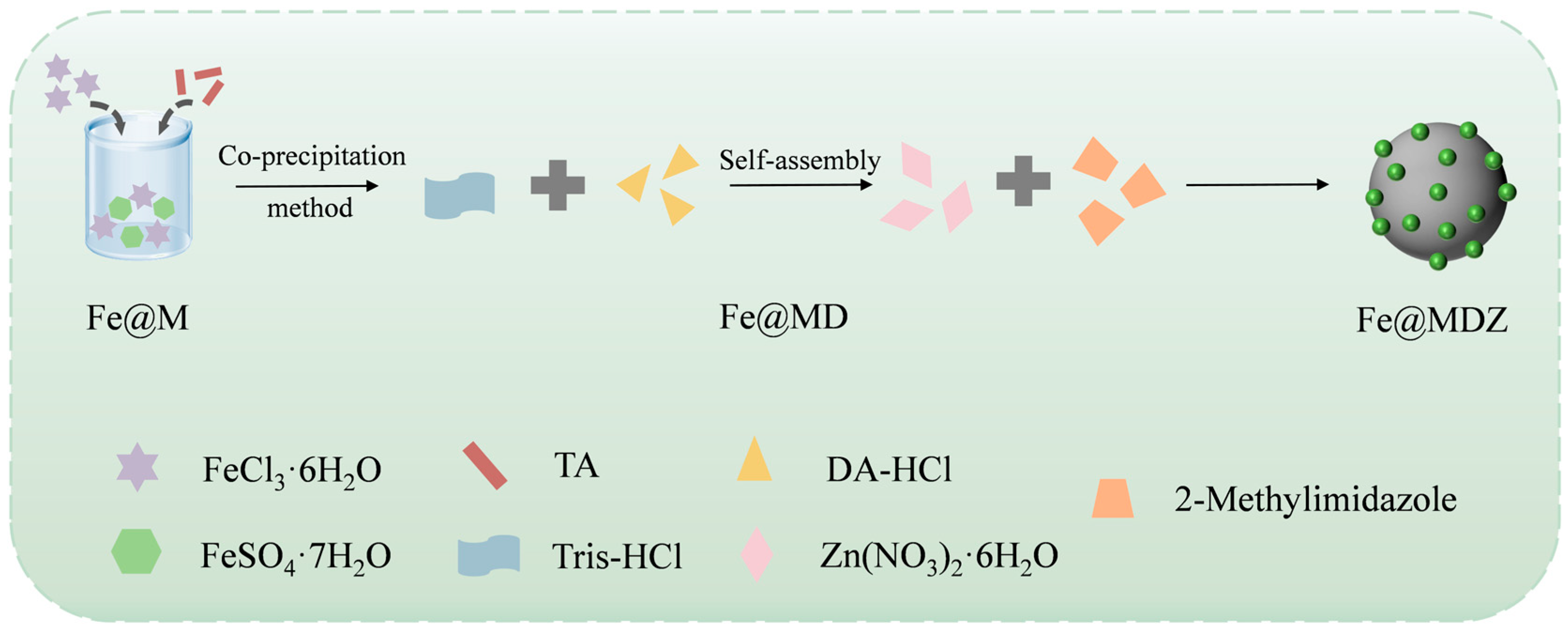 2.5. Preparation of Fe3O4@MPN@PDA@ZIF-8