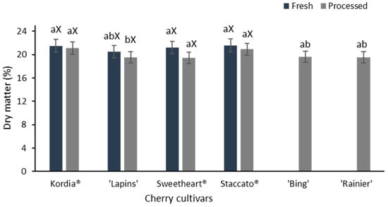 Dry matter content of the six cherry cultivars analyzed in this experiment. (Note: fresh samples were not provided for ‘Bing’ and ‘Rainier’ cultivars). Superscript lowercase letters (a, b) indicate significant differences among all cultivars (n = 6, Tukey’s test, p < 0.05), whereas the superscript uppercase letter (X) indicates no significant variation (p > 0.05, n = 4) between the fresh and processed samples of the same cultivar.