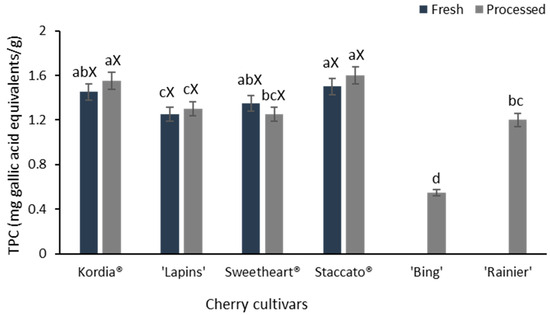 Total phenolic content TPC (mg gallic acid equivalents/g) of fresh and processed cherry samples on the dry weight basis (Note: fresh samples were not available for ‘Bing’ and ‘Rainier’ cultivars). Superscript lowercase letters (a–d) indicate significant differences among all cultivars (n = 6, Tukey’s test, p < 0.05), whereas the superscript uppercase letter (X) indicates no significant variation (p > 0.05, n = 4) between the fresh and processed samples of the same cultivar.