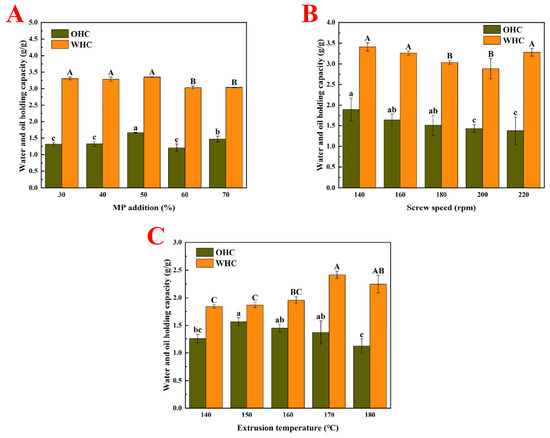 Figure 1. Water- and oil-holding capacities of PMP produced using different extrusion parameters. (A). Effect of different MP addition amounts on water- and oil-holding capacities of PMP. (B). Effect of different screw speeds on water- and oil-holding capacities of PMP. (C). Effect of different extrusion temperatures on water- and oil-holding capacities of PMP. Capital letters indicate significant differences among WHC, while lowercase letters indicate significant differences among OHC.