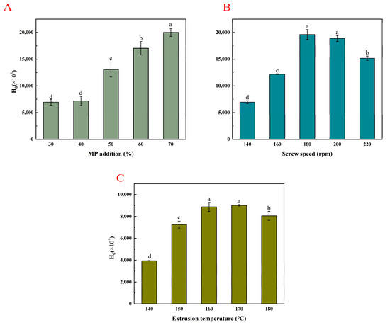 As shown in Figure 1, the amount of MP added, along with the screw speed and extrusion temperature, significantly affected the oil-holding capacity (OHC) and water-holding capacity (WHC) of the PMP.