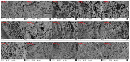 Figure 1C shows that as the extrusion temperature increased, both the OHC and WHC of the PMP first increased and then decreased. Specifically, when the extrusion temperature was 150 °C, the OHC of the PMP reached its maximum; when the temperature rose to 170 °C, its WHC reached its peak. This phenomenon may be related to changes in the protein structure caused by high-temperature treatment, exposure or changes to surface hydrophobic/hydrophilic groups, or changes in the aggregation state. Under the influence of high pressure inside the extruder, proteins may undergo excessive denaturation or thermal damage, which disrupts their structure and reduces their OHC and WHC. Higher temperatures promote protein unfolding, exposing more hydrophobic and hydrophilic groups, which facilitate the physical retention and binding of oil [41]. These findings aligned with the SEM observations, which revealed fibrous and highly cross-linked structures resulting from the aggregation of protein molecules (PPI and MP) [13].