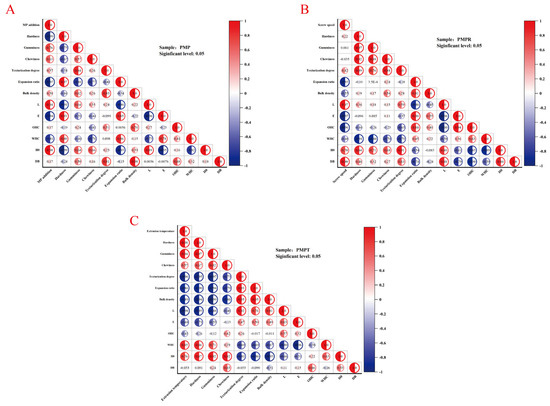 In Figure 1A, when the amount of MP was 50%, the PMP exhibited the highest OHC and WHC of 1.66 g/g and 3.35 g/g, respectively. This may be because, with a 50% addition, the protein network achieved its optimal state, providing the maximum OHC and WHC. Increasing the MP amount resulted in a decrease in the total pea protein content, which affected the OHC/WHC due to changes in protein interaction dynamics. Meanwhile, beyond this optimal addition level, excessive water may result in an overly tight network structure or weakened interactions between proteins, thereby reducing the oil- and water-holding capacities [45,46].