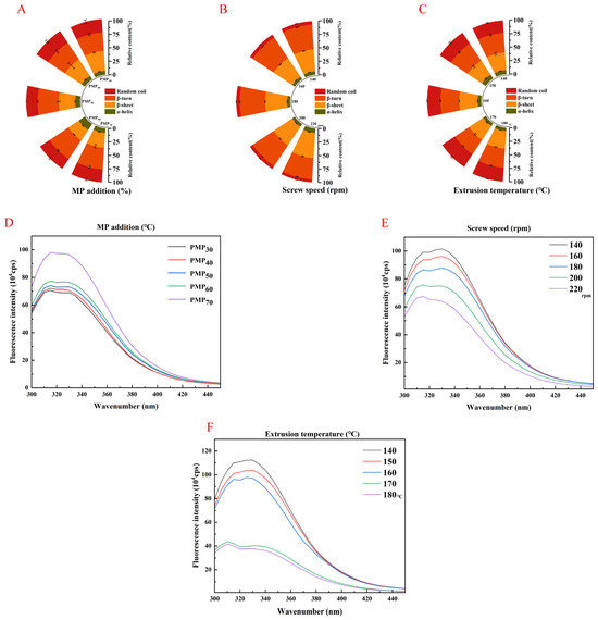 Figure 5. Protein structure of PMP produced using different extrusion parameters. (A). Effect of different MP addition amounts on infrared secondary protein structure of PMP. (B). Effect of different screw speeds on infrared secondary protein structure of PMP. (C). Effect of different extrusion temperatures on infrared secondary protein structure of PMP. (D). Effect of different MP addition amounts on intrinsic tryptophan fluorescence of PMP. (E). Effect of different screw speeds on intrinsic tryptophan fluorescence of PMP. (F). Effect of different extrusion temperatures on intrinsic tryptophan fluorescence of PMP.