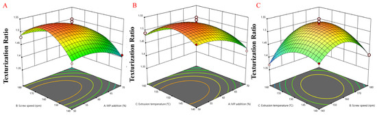 Figure 6. Three-dimensional response surface modeling graph for response variables. (A). Three-dimensional response surface plot of texturization degree of PMP as a function of MP addition amount (%) and screw speed (rpm). (B). Three-dimensional response surface plot of texturization degree of PMP as a function of MP addition amount (%) and extrusion temperature (°C). (C). Three-dimensional response surface plot of texturization degree of PMP as a function of screw speed (rpm) and extrusion temperature (°C).